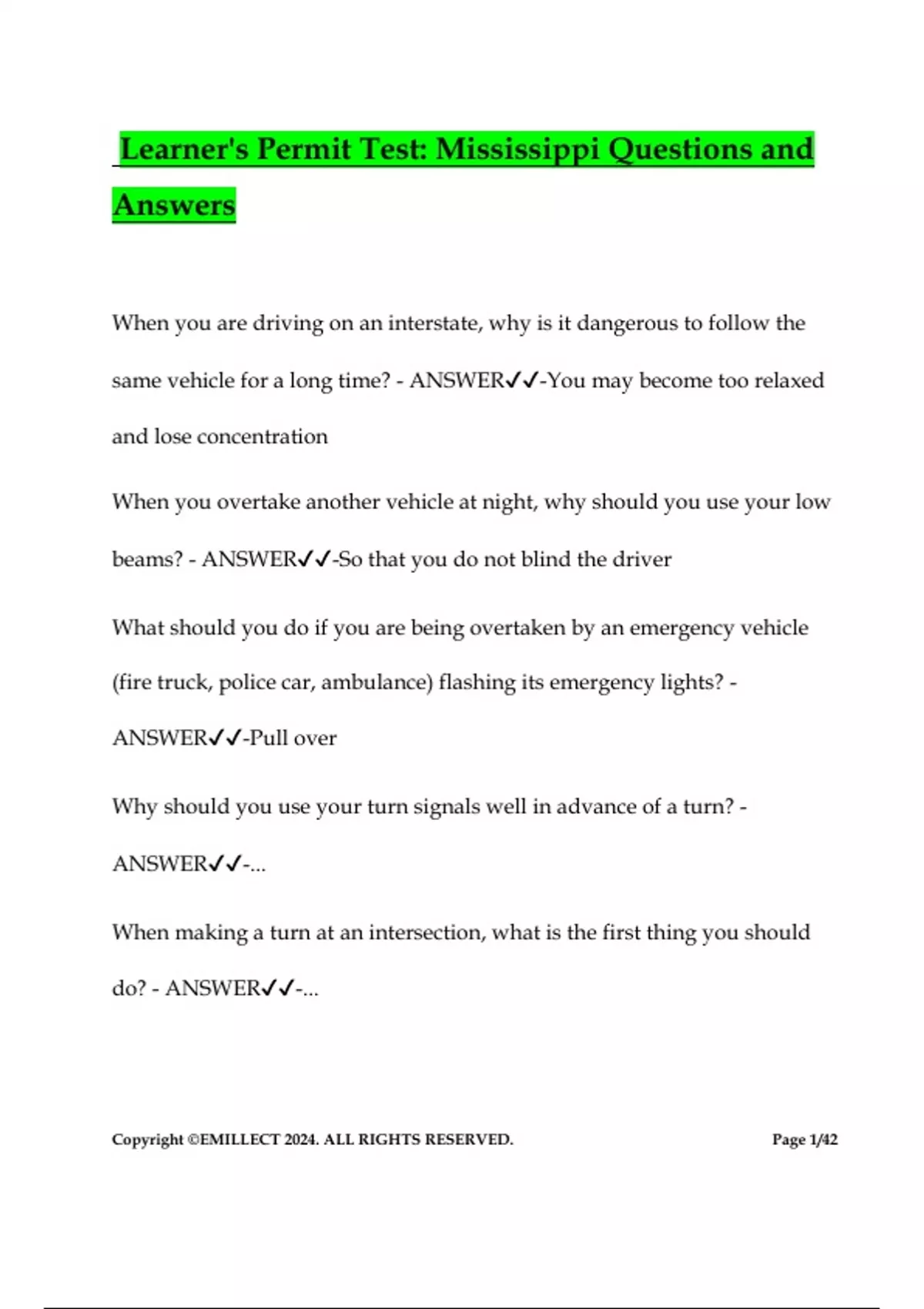 Learner's Permit Test: Mississippi Questions and Answers When you are driving on an interstate, why is it dangerous to follow the same vehicle for a long time? - ANSWER-You may become too relaxed and lose concentration When you overtake another vehicle at night, why should you use your low beams? - ANSWER-So that you do not blind the driver What should you do if you are being overtaken by an emergency vehicle (fire truck, police car, ambulance) flashing its emergency lights? - ANSWER-Pull over