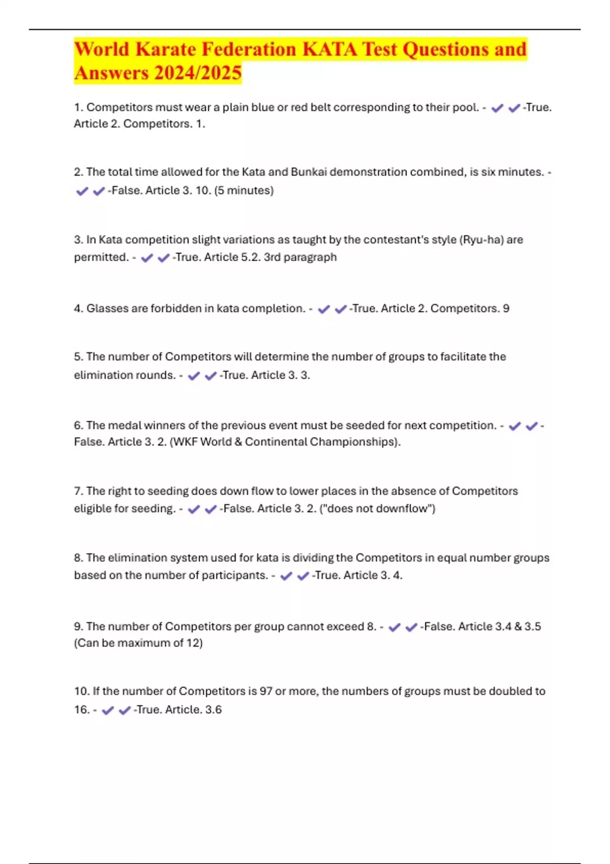 World Karate Federation KATA Test Questions and Answers 2024/2025 1. Competitors must wear a plain blue or red belt corresponding to their pool. - -True. Article 2. Competitors. 1. 2. The total time allowed for the Kata and Bunkai demonstration combined, is six minutes. - -False. Article 3. 10. (5 minutes) 3. In Kata competition slight v