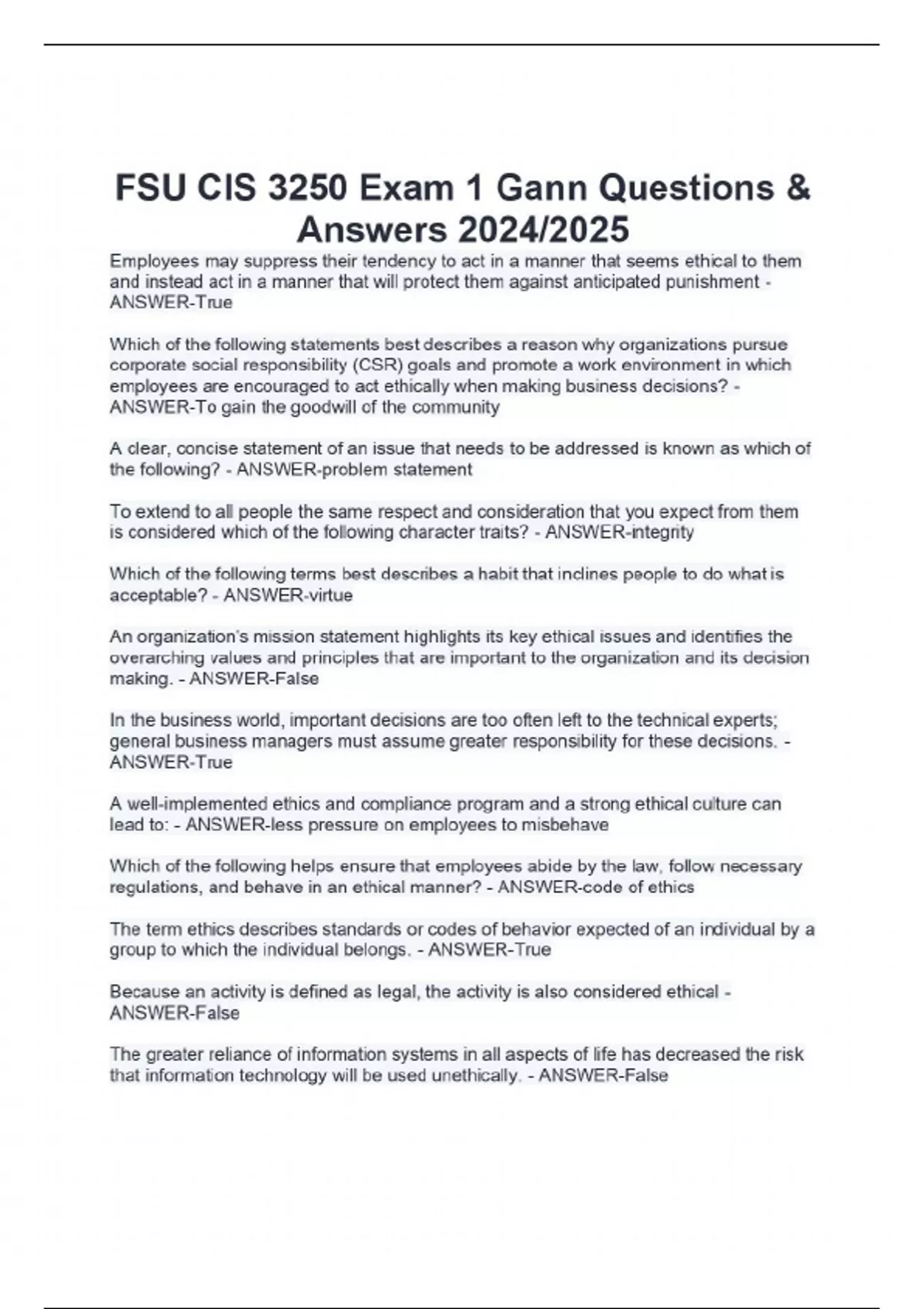 FSU CIS 3250 Exam 1 Gann Questions & Answers 2024/2025 Employees may suppress their tendency to act in a manner that seems ethical to them and instead act in a manner that will protect them against anticipated punishment - ANSWER-True Which of the following statements best describes a reason why organizations pursue corporate social responsibility (CSR) goals and promote a work environment in which employees are encouraged to act ethically when making business decisions? - ANSWER-To gain the goodwill of the community A clear, concise statement of an issue that needs to be addressed is known as which of the following? - ANSWER-problem statement To extend to all people the same respect and consideration that you expect from them is considered which of the following character traits? - ANSWER-integrity Which of the following terms best describes a habit that inclines people to do what is acceptable? - ANSWER-virtue An organization's mission statement highlights its key ethical issues and identifies the overarching values and principles that are important to the organization and its decision making. - ANSWER-False In the business world, important decisions are too often left to the technical experts; general business managers must assume greater responsibility for these decisions. - ANSWER-True A well-implemented ethics and compliance program and a strong ethical culture can lead to: - ANSWER-less pressure on employees to misbehave Which of the following helps ensure that employees abide by the law, follow necessary regulations, and behave in an ethical manner? - ANSWER-code of ethics The term ethics describes standards or codes of behavior expected of an individual by a group to which the individual belongs. - ANSWER-True Because an activity is defined as legal, the activity is also considered ethical - ANSWER-False The greater reliance of information systems in all aspects of life has decreased the risk that information technology will be used unethically. - ANSWER-False A code of ethics cannot gain company-wide acceptance unless it is fully endorsed by the organization's leadership and developed with which of the following? - ANSWER-employee participation Increasingly, managers are including ethical conduct as part of an employee's performance appraisal. - ANSWER-True A statement that highlights an organization's key ethical issues and identifies the overarching values and principles that are important to the organization and its decision making is known as which of the following? - ANSWER-code of ethics The board of directors of an organization is normally responsible for day-to-day management and operations of the organization. - ANSWER-False Ideally, the corporate ethics officer should be a well-respected, senior-level manager who reports directly to the CEO. - ANSWER-True Legal acts conform to what an individual believes to be the right thing to do. - ANSWER-False Consistency means that shareholders, customers, suppliers, and the community know what they can expect of an organization-that it will behave in the future much as it has in Continues...