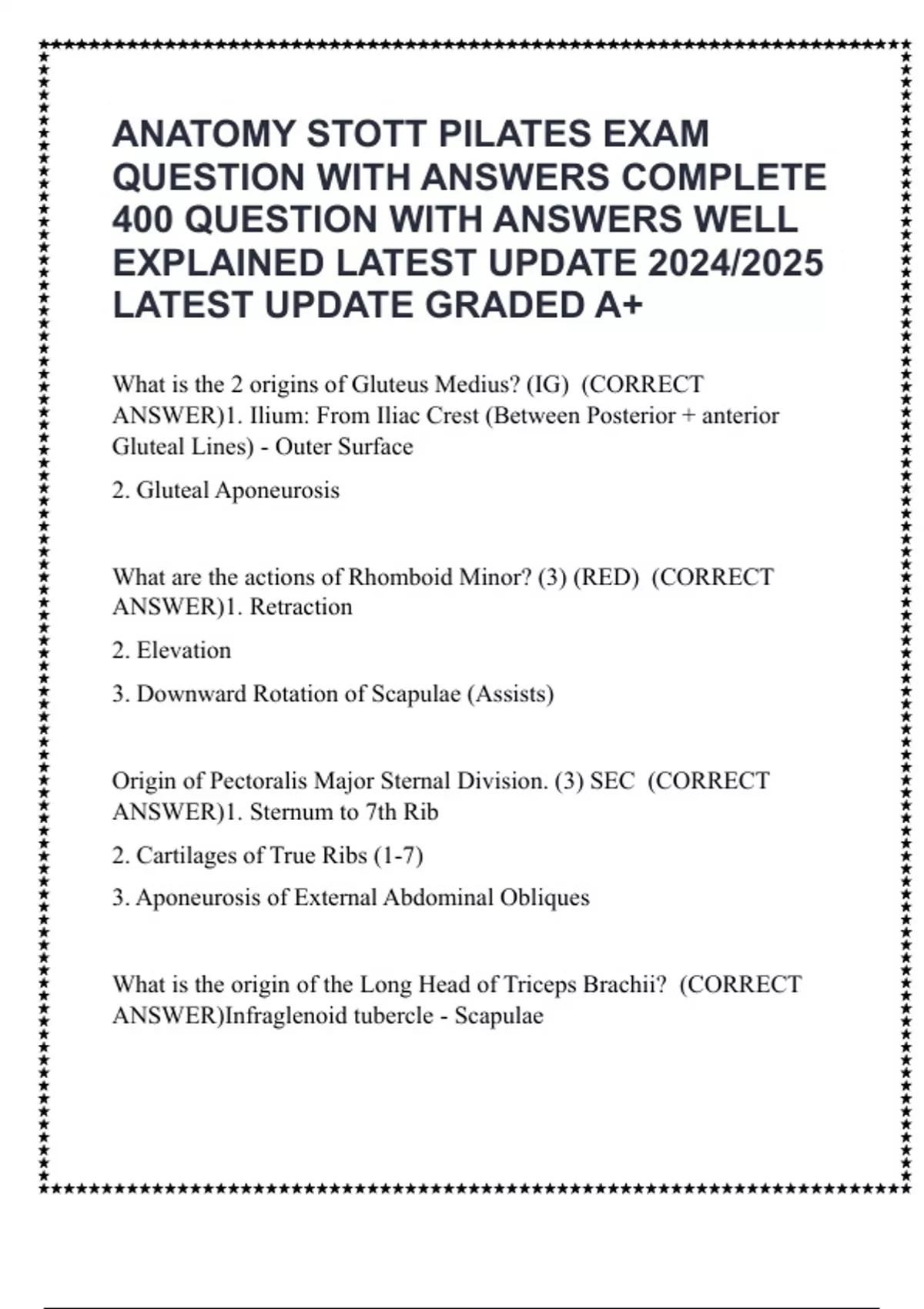 ANATOMY STOTT PILATES EXAM QUESTION WITH ANSWERS COMPLETE 400 QUESTION WITH ANSWERS WELL EXPLAINED LATEST UPDATE 2024/2025 LATEST UPDATE GRADED A+