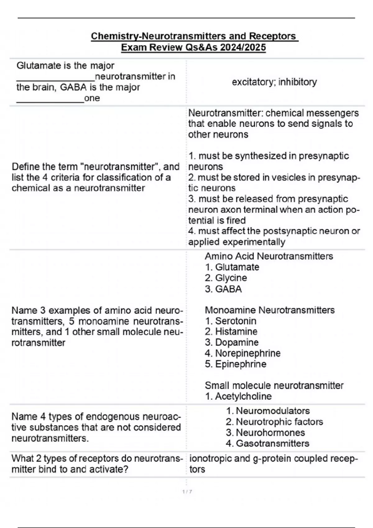 Chemistry-Neurotransmitters and Receptors Exam Review Qs&As 2024/2025