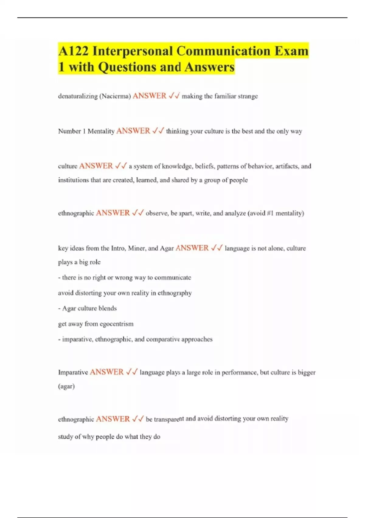 A122 Interpersonal Communication Exam 1 with Questions and Answers denaturalizing (Nacierma) ANSWER making the familiar strange Number 1 Mentality ANSWER thinking your culture is the best and the only way culture ANSWER a system of knowledge, beliefs, patterns of behavior, artifacts, and institutions that are created, learned, and shared by a group of people ethnographic ANSWER observe, be apart, write, and analyze (avoid #1 mentality) key ideas from the Intro, Miner, and Agar ANSWER language is not alone, culture plays a big role - there is no right or wrong way to communicate avoid distorting your own reality in ethnography - Agar culture blends get away from egocentrism - imparative, ethnographic, and comparative approaches Imparative ANSWER language plays a large role in performance, but culture is bigger (agar) ethnographic ANSWER be transparent and avoid distorting your own reality study of why people do what they do
