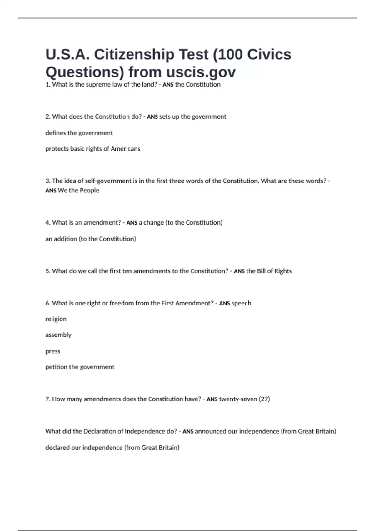U.S.A. Citizenship Test (100 Civics Questions) from uscis.gov