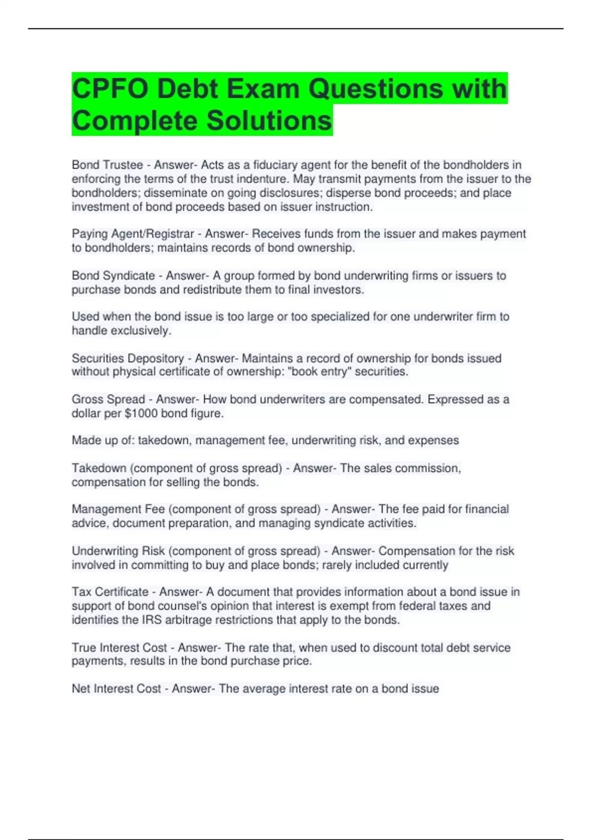 CPFO Debt Exam Questions with Complete Solutions Bond Trustee - Answer- Acts as a fiduciary agent for the benefit of the bondholders in enforcing the terms of the trust indenture. May transmit payments from the issuer to the bondholders; disseminate on going disclosures; disperse bond proceeds; and place investment of bond proceeds based on issuer instruction. Paying Agent/Registrar - Answer- Receives funds from the issuer and makes payment to bondholders; maintains records of bond ownership. Bond Syndicate - Answer- A group formed by bond underwriting firms or issuers to purchase bonds and redistribute them to final investors. Used when the bond issue is too large or too specialized for one underwriter firm to handle exclusively. Securities Depository - Answer- Maintains a record of ownership for bonds issued without physical certificate of ownership: "book entry" securities. Gross Spread - Answer- How bond underwriters are compensated. Expressed as a dollar per $1000 bond figure. Made up of: takedown, management fee, underwriting risk, and expenses Takedown (component of gross spread) - Answer- The sales commission, compensation for selling the bonds. Management Fee (component of gross spread) - Answer- The fee paid for financial advice, document preparation, and managing syndicate activities. Underwriting Risk (component of gross spread) - Answer- Compensation for the risk involved in committing to buy and place bonds; rarely included currently Tax Certificate - Answer- A document that provides information about a bond issue in support of bond counsel's opinion that interest is exempt from federal taxes and identifies the IRS arbitrage restrictions that apply to the bonds. True Interest Cost - Answer- The rate that, when used to discount total debt service payments, results in the bond purchase price.