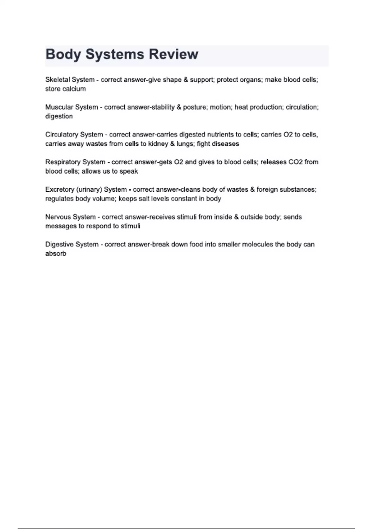 Body Systems Review questions and answers.