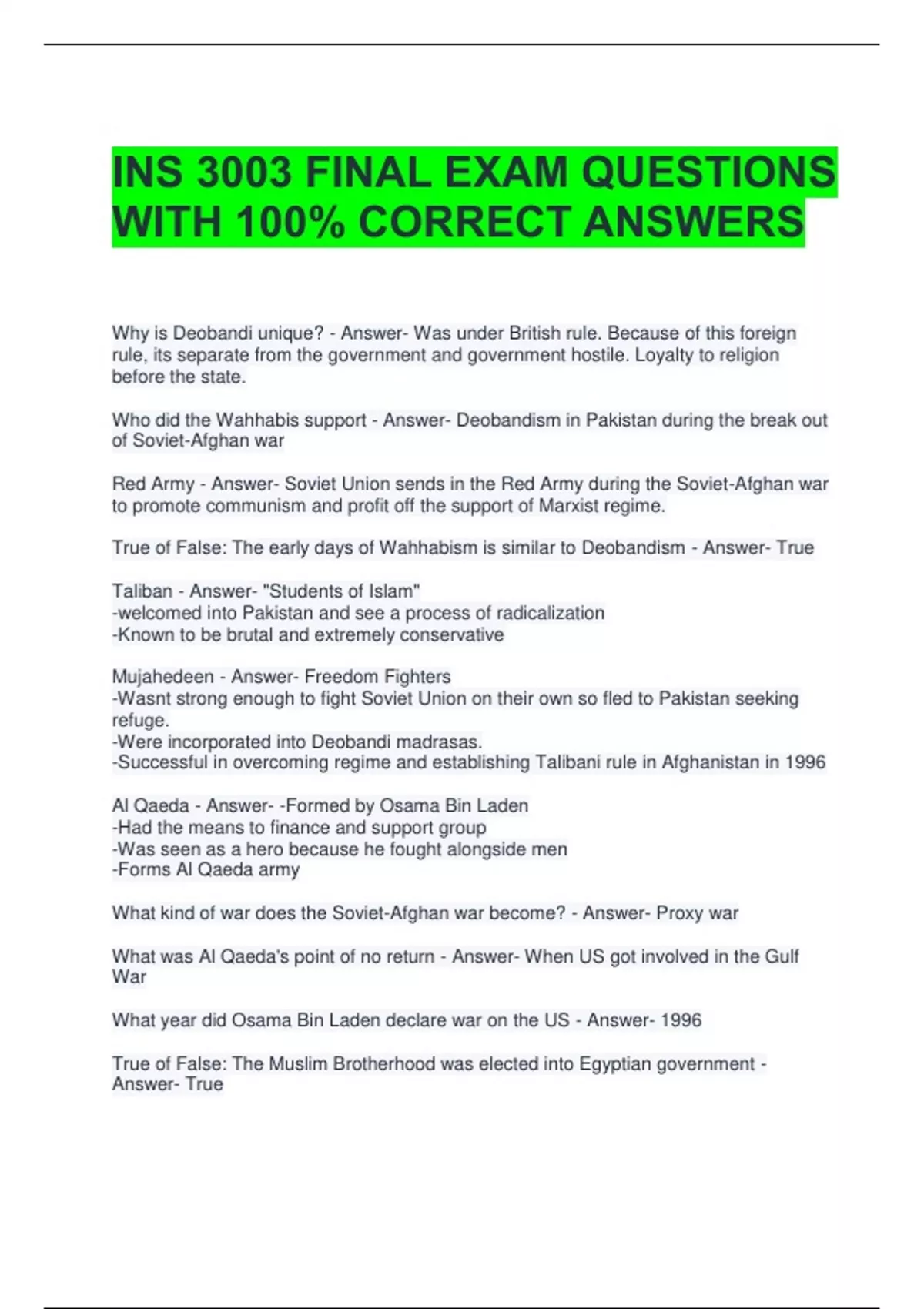 INS 3003 FINAL EXAM QUESTIONS WITH 100% CORRECT ANSWERS Why is Deobandi unique? - Answer- Was under British rule. Because of this foreign rule, its separate from the government and government hostile. Loyalty to religion before the state. Who did the Wahhabis support - Answer- Deobandism in Pakistan during the break out of Soviet-Afghan war Red Army - Answer- Soviet Union sends in the Red Army during the Soviet-Afghan war to promote communism and profit off the support of Marxist regime. True of False: The early days of Wahhabism is similar to Deobandism - Answer- True Taliban - Answer- "Students of Islam" -welcomed into Pakistan and see a process of radicalization -Known to be brutal and extremely conservative Mujahedeen - Answer- Freedom Fighters -Wasnt strong enough to fight Soviet Union on their own so fled to Pakistan seeking refuge. -Were incorporated into Deobandi madrasas. -Successful in overcoming regime and establishing Talibani rule in Afghanistan in 1996 Al Qaeda - Answer- -Formed by Osama Bin Laden -Had the means to finance and support group -Was seen as a hero because he fought alongside men -Forms Al Qaeda army What kind of war does the Soviet-Afghan war become? - Answer- Proxy war What was Al Qaeda's point of no return - Answer- When US got involved in the Gulf War What year did Osama Bin Laden declare war on the US - Answer- 1996 True of False: The Muslim Brotherhood was elected into Egyptian government - Answer- True