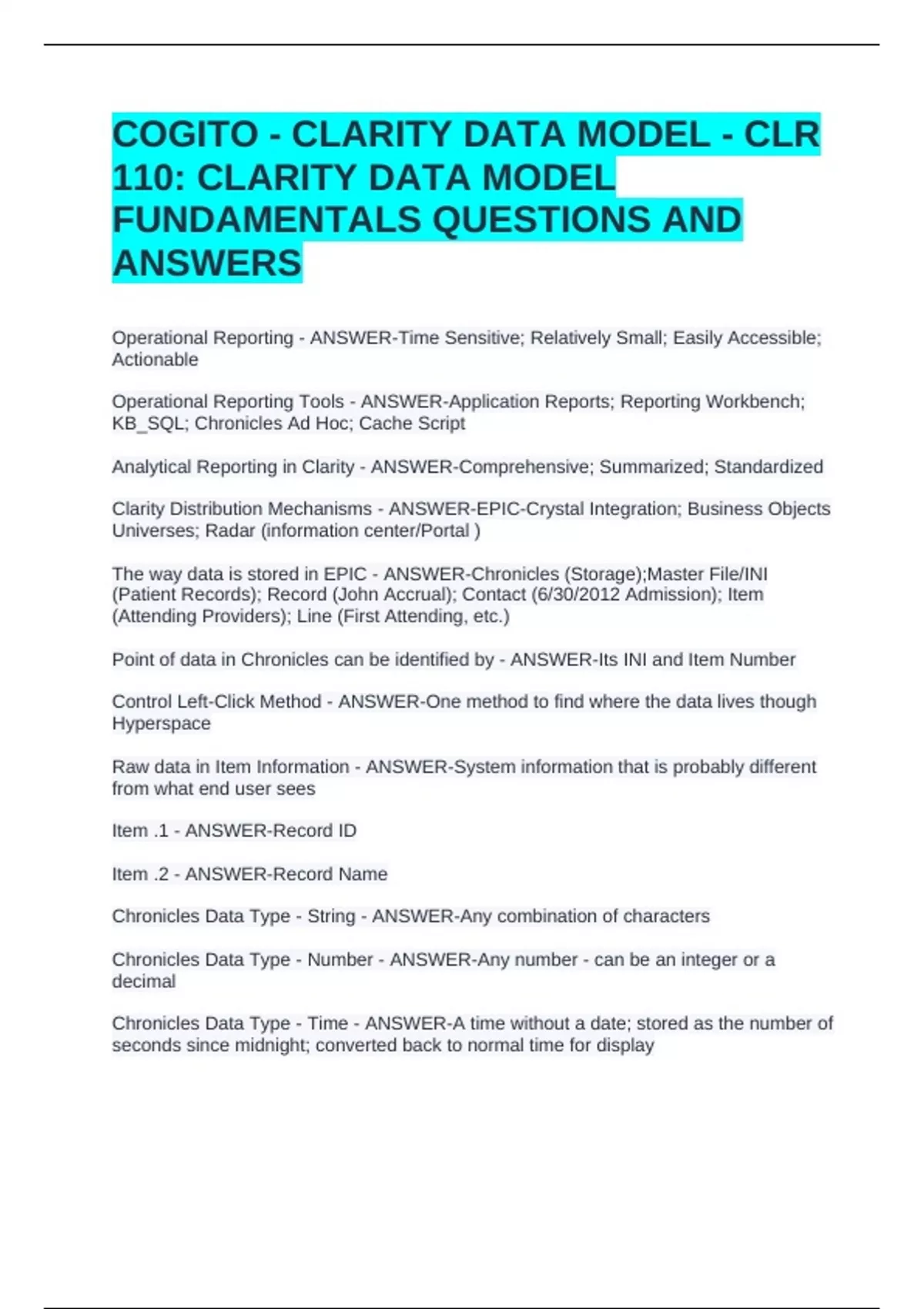 COGITO - CLARITY DATA MODEL - CLR 110: CLARITY DATA MODEL FUNDAMENTALS QUESTIONS AND ANSWERSCOGITO - CLARITY DATA MODEL - CLR 110: CLARITY DATA MODEL FUNDAMENTALS QUESTIONS AND ANSWERSCOGITO - CLARITY DATA MODEL - CLR 110: CLARITY DATA MODEL FUNDAMENTALS QUESTIONS AND ANSWERS Operational Reporting - ANSWER-Time Sensitive; Relatively Small; Easily Accessible; Actionable Operational Reporting Tools - ANSWER-Application Reports; Reporting Workbench; KB_SQL; Chronicles Ad Hoc; Cache Script Analytical Reporting in Clarity - ANSWER-Comprehensive; Summarized; Standardized Clarity Distribution Mechanisms - ANSWER-EPIC-Crystal Integration; Business Objects Universes; Radar (information center/Portal )