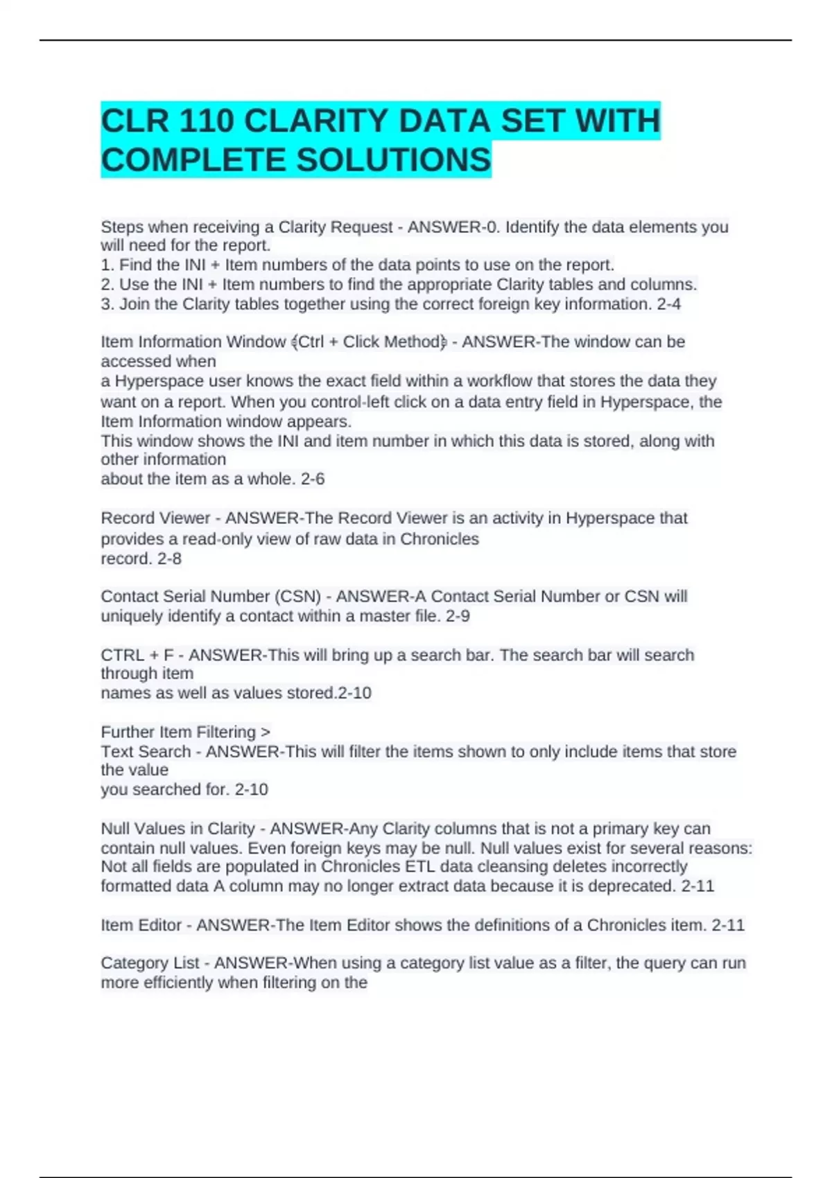 CLR 110 CLARITY DATA SET WITH COMPLETE SOLUTIONSCLR 110 CLARITY DATA SET WITH COMPLETE SOLUTIONSCLR 110 CLARITY DATA SET WITH COMPLETE SOLUTIONSSteps when receiving a Clarity Request - ANSWER-0. Identify the data elements you will need for the report. 1. Find the INI + Item numbers of the data points to use on the report. 2. Use the INI + Item numbers to find the appropriate Clarity tables and columns. 3. Join the Clarity tables together using the correct foreign key information. 2-4 Item Information Window ﴾Ctrl + Click Method﴿ - ANSWER-The window can be accessed when a Hyperspace user knows the exact field within a workflow that stores the data they want on a report. When you control‐left click on a data entry field in Hyperspace, the Item Information window appears. This window shows the INI and item number in which this data is stored, along with other information about the item as a whole. 2-6
