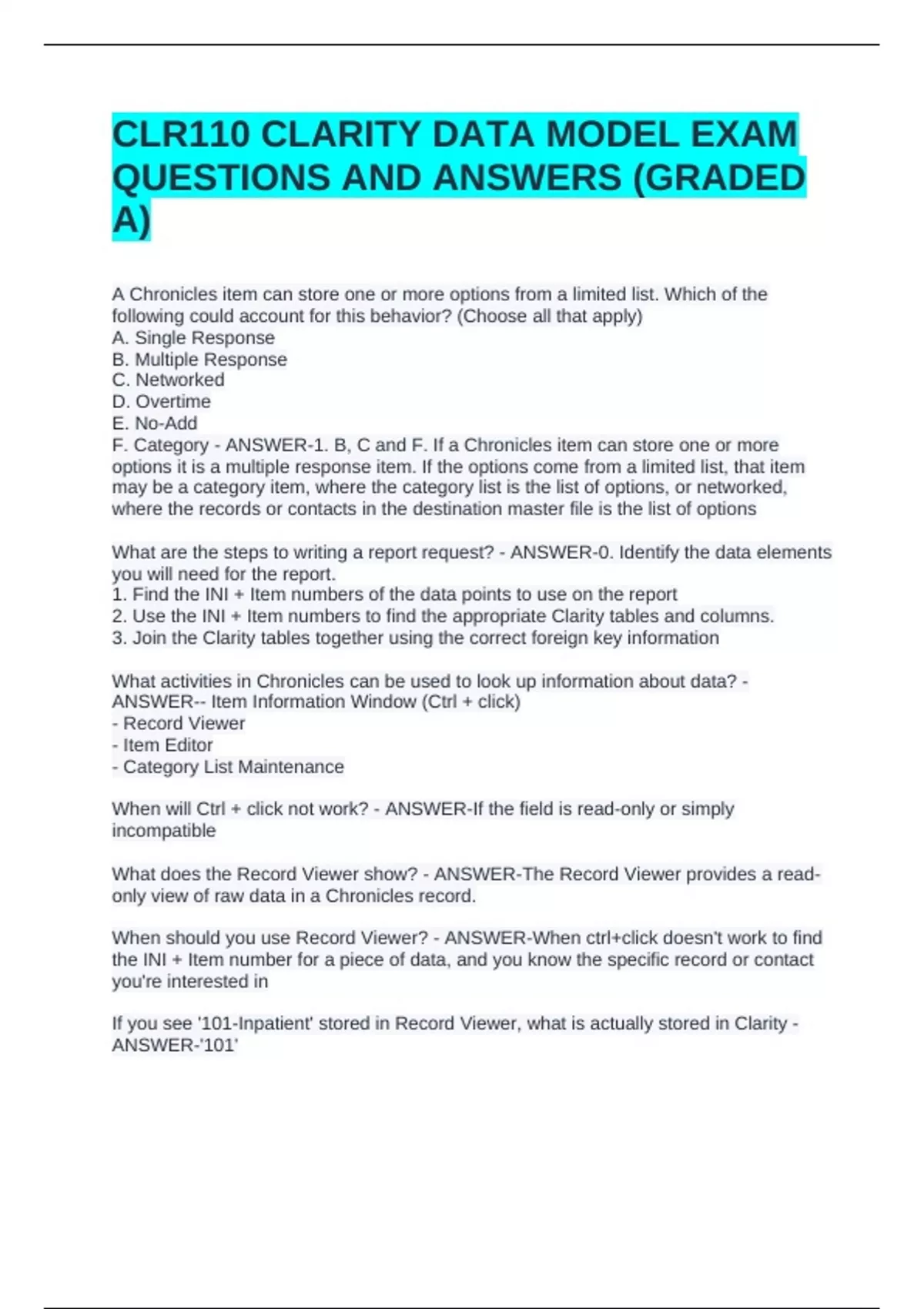 CLR110 CLARITY DATA MODEL EXAM QUESTIONS AND ANSWERS (GRADED A)CLR110 CLARITY DATA MODEL EXAM QUESTIONS AND ANSWERS (GRADED A)CLR110 CLARITY DATA MODEL EXAM QUESTIONS AND ANSWERS (GRADED A) A Chronicles item can store one or more options from a limited list. Which of the following could account for this behavior? (Choose all that apply) A. Single Response B. Multiple Response C. Networked D. Overtime E. No-Add F. Category - ANSWER-1. B, C and F. If a Chronicles item can store one or more options it is a multiple response item. If the options come from a limited list, that item may be a category item, where the category list is the list of options, or networked, where the records or contacts in the destination master file is the list of options What are the steps to writing a report request? - ANSWER-0. Identify the data elements you will need for the report.