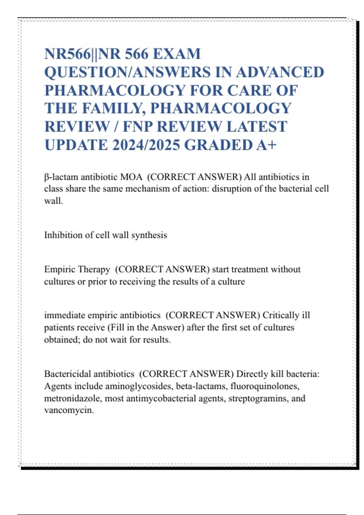 NR566||NR 566 EXAM QUESTION/ANSWERS IN ADVANCED PHARMACOLOGY FOR CARE OF THE FAMILY, PHARMACOLOGY REVIEW / FNP REVIEW LATEST UPDATE 2024/2025 GRADED A+