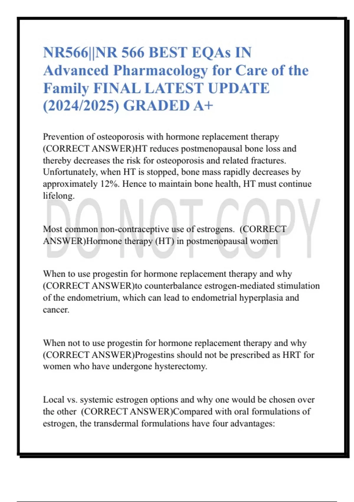 (CORRECT ANSWER)Progestins should not be prescribed as HRT for