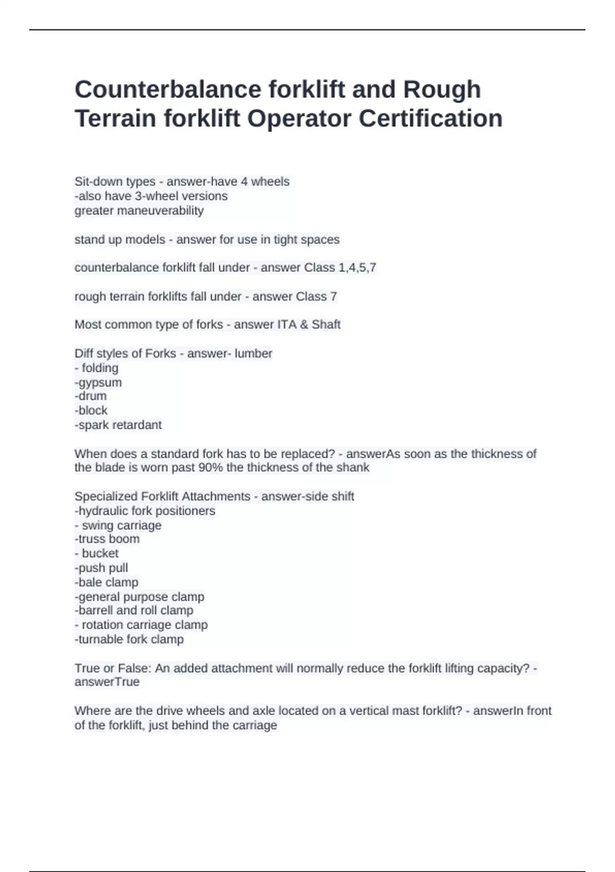 Counterbalance forklift and Rough Terrain forklift Operator Certification Questions and Answers 2024