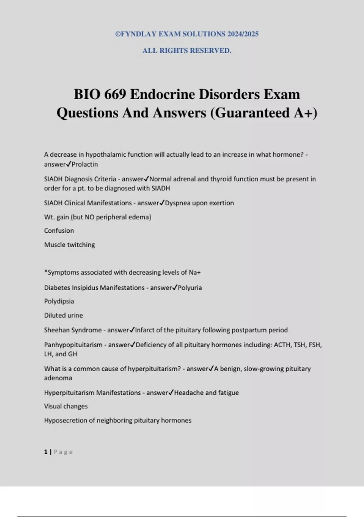 ©FYNDLAY EXAM SOLUTIONS 2024/2025 ALL RIGHTS RESERVED. 1 | P a g e BIO 669 Endocrine Disorders Exam Questions And Answers (Guaranteed A+) A decrease in hypothalamic function will actually lead to an increase in what hormone? - answerProlactin SIADH Diagnosis Criteria - answerNormal adrenal and thyroid function must be present in order for a pt. to be diagnosed with SIADH SIADH Clinical Manifestations - answerDyspnea upon exertion Wt. gain (but NO peripheral edema) Confusion Muscle twitching *Symptoms associated with decreasing levels of Na+ Diabetes Insipidus Manifestations - answerPolyuria Polydipsia Diluted urine Sheehan Syndrome - answerInfarct of the pituitary following postpartum period Panhypopituitarism - answerDeficiency of all pituitary hormones including: ACTH, TSH, FSH, LH, and GH What is a common cause of hyperpituitarism? - answerA benign, slow-growing pituitary adenoma Hyperpituitarism Manifestations - answerHeadache and fatigue Visual changes Hyposecretion of neighboring pituitary hormones
