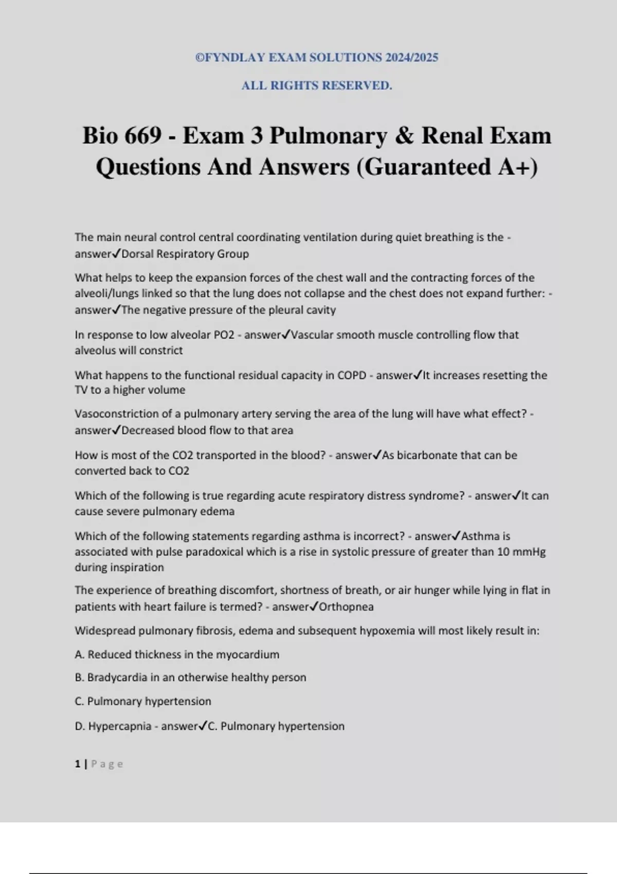 ©FYNDLAY EXAM SOLUTIONS 2024/2025 ALL RIGHTS RESERVED. 1 | P a g e Bio 669 - Exam 3 Pulmonary & Renal Exam Questions And Answers (Guaranteed A+) The main neural control central coordinating ventilation during quiet breathing is the - answerDorsal Respiratory Group What helps to keep the expansion forces of the chest wall and the contracting forces of the alveoli/lungs linked so that the lung does not collapse and the chest does not expand further: - answerThe negative pressure of the pleural cavity In response to low alveolar PO2 - answerVascular smooth muscle controlling flow that alveolus will constrict What happens to the functional residual capacity in COPD - answerIt increases resetting the TV to a higher volume Vasoconstriction of a pulmonary artery serving the area of the lung will have what effect? - answerDecreased blood flow to that area How is most of the CO2 transported in the blood? - answerAs bicarbonate that can be converted back to CO2 Which of the following is true regarding acute respiratory distress syndrome? - answerIt can cause severe pulmonary edema Which of the following statements regarding asthma is incorrect? - answerAsthma is associated with pulse paradoxical which is a rise in systolic pressure of greater than 10 mmHg during inspiration The experience of breathing discomfort, shortness of breath, or air hunger while lying in flat in patients with heart failure is termed? - answerOrthopnea Widespread pulmonary fibrosis, edema and subsequent hypoxemia will most likely result in: A. Reduced thickness in the myocardium B. Bradycardia in an otherwise healthy person C. Pulmonary hypertension D. Hypercapnia - answerC. Pulmonary hypertension