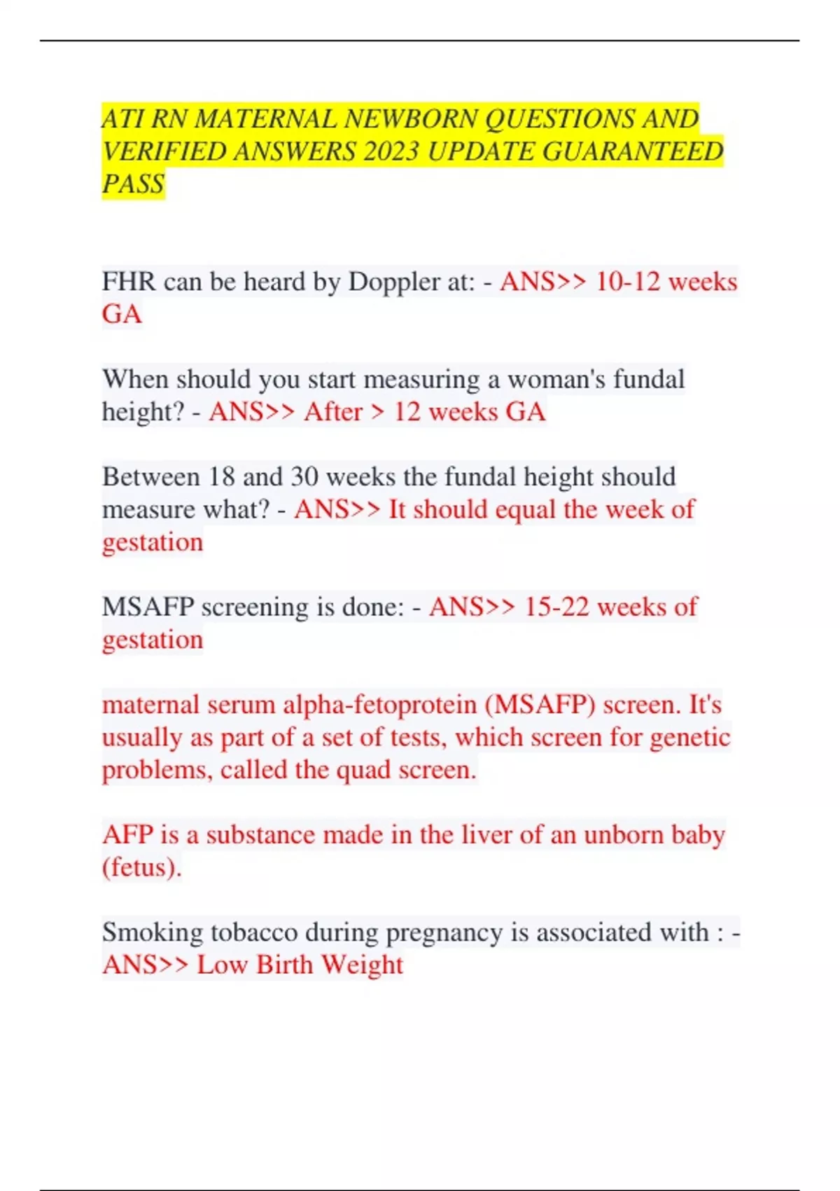 ATI RN MATERNAL NEWBORN QUESTIONS AND VERIFIED ANSWERS 2023 UPDATE GUARANTEED PASS FHR can be heard by Doppler at: - ANS>> 10-12 weeks GA When should you start measuring a woman's fundal height? - ANS>> After > 12 weeks GA Between 18 and 30 weeks the fundal height should measure what? - ANS>> It should equal the week of gestation MSAFP screening is done: - ANS>> 15-22 weeks of gestation maternal serum alpha-fetoprotein (MSAFP) screen. It's usually as part of a set of tests, which screen for genetic problems, called the quad screen. AFP is a substance made in the liver of an unborn baby (fetus). Smoking tobacco during pregnancy is associated with : - ANS>> Low Birth Weight Pregnant mothers should consume how much water each day? - ANS>> 2 to 3 Liters of water from food and beverage sources. Regarding kick counts, what are signs that a woman needs further evaluation? - ANS>> Fetal movements of less than 3 in one hour No fetal movement for 12 hours The recommended weight gain during pregnancy is usually: - ANS>> 25-35lbs 3-4 lb in first trimester 1 lb per week in the last two trimesters Foods high in folic acid are: - ANS>> Leafy vegetables Dried peas Dried beans Seeds Orange juice It is recommended that _____ mcg of folic acid be taken during pregnancy. - ANS>> 600 It is recommended that clients who are lactating consume ____ mcg of folic acid. - ANS>> 500 What vitamin aids in the absorption of Iron? - ANS>> Vitamin C The clients bladder needs to be _____ before an ultrasound. - ANS>> Full biophysical profile (BPP) normal score is - ANS>> A biophysical profile (BPP) test measures the health of your baby (fetus) during pregnancy. 8-10 BPP abnormal score is - ANS>> <4 If a BPP comes back as 6..... - ANS>> It should be retested BPP assess for - ANS>> Fetal well being non-stress test ( NST) - ANS>> most widely used technique for antepartum evaluation of fetal well being performed during the third trimester. Reactive NST - ANS>> FHR is a normal baseline rate with moderate variablity Two accelerations to 15 bpm for at least 15 secs in 20 min period A non reactive NST would indicate what about the fetus? - ANS>> The fetal heart rate does not accelerate adequately with fetal movement. -A BPP or CST will need to be done now Positive CST is normal or abnormal - ANS>> abnormal The contraction stress test — also called a stress test or an oxytocin challenge test — may be done during pregnancy to measure the baby's heart rate during uterine contractions. Its purpose is to make sure the baby can get the oxygen he needs from the placenta during labor. Positive CST is indicated when: - ANS>> Persistent and consistent late decels on more than half of the contractions. An amniocentesis may be performed when? - ANS>> After 14 weeks gestation AFP can be measured from the amniotic fluid between: - ANS>> 16 and 18 weeks alpha-fetoprotein Presence of PG on a fetal lung test is associated with: - ANS>> Respiratory distress CVS can be done at - ANS>> 10-12 weeks
