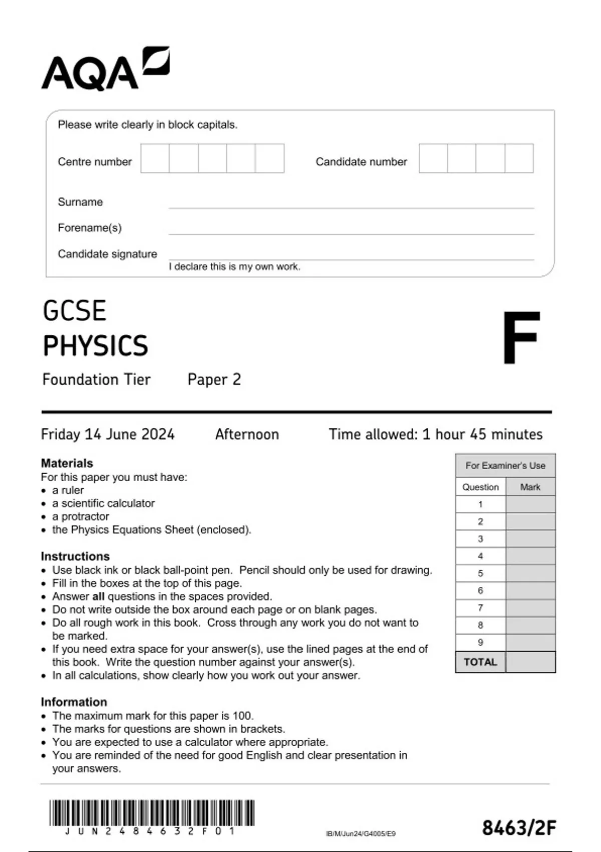 AQA GCSE PHYSICS Foundation Tier Paper 2 JUNE 2024 QUESTION PAPER