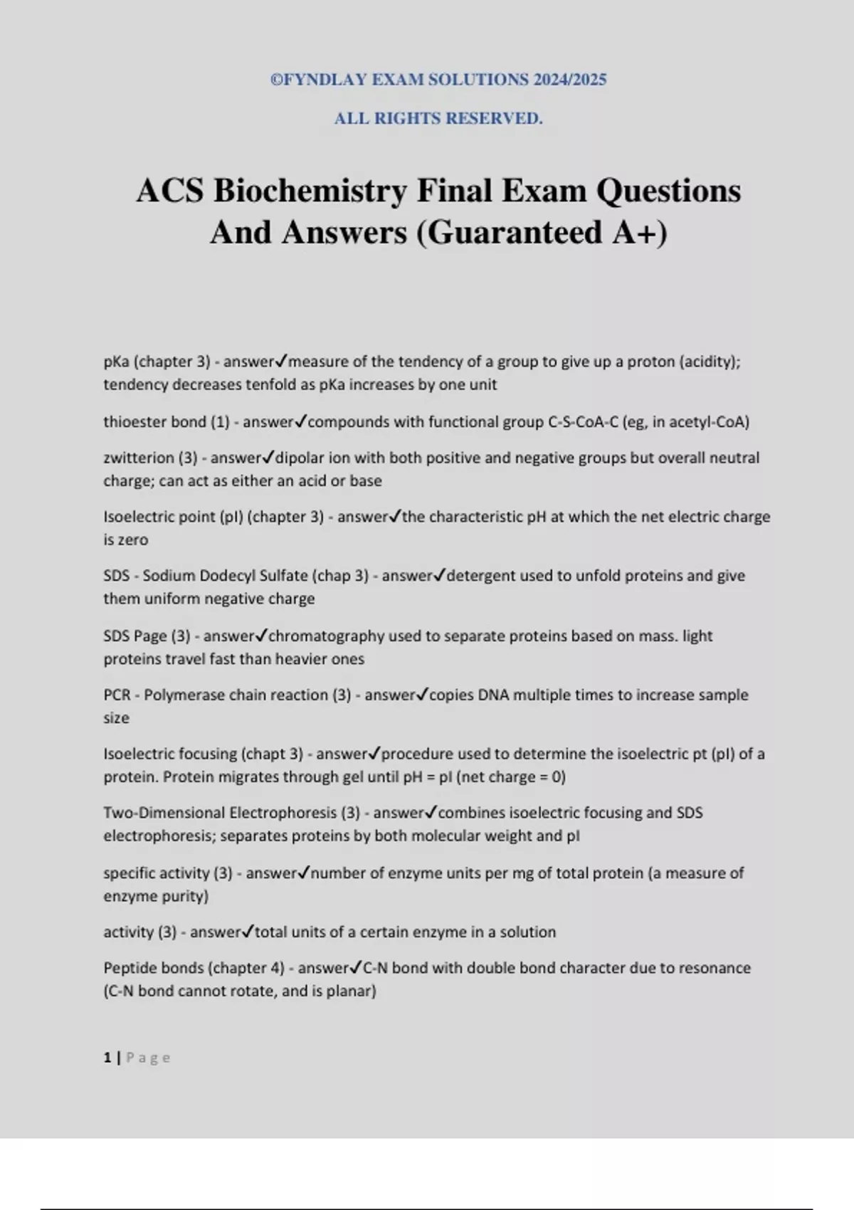 ©FYNDLAY EXAM SOLUTIONS 2024/2025 ALL RIGHTS RESERVED. 1 | P a g e ACS Biochemistry Final Exam Questions And Answers (Guaranteed A+) pKa (chapter 3) - answermeasure of the tendency of a group to give up a proton (acidity); tendency decreases tenfold as pKa increases by one unit thioester bond (1) - answercompounds with functional group C-S-CoA-C (eg, in acetyl-CoA) zwitterion (3) - answerdipolar ion with both positive and negative groups but overall neutral charge; can act as either an acid or base Isoelectric point (pI) (chapter 3) - answerthe characteristic pH at which the net electric charge is zero SDS - Sodium Dodecyl Sulfate (chap 3) - answerdetergent used to unfold proteins and give them uniform negative charge SDS Page (3) - answerchromatography used to separate proteins based on mass. light proteins travel fast than heavier ones PCR - Polymerase chain reaction (3) - answercopies DNA multiple times to increase sample size Isoelectric focusing (chapt 3) - answerprocedure used to determine the isoelectric pt (pI) of a protein. Protein migrates through gel until pH = pI (net charge = 0) Two-Dimensional Electrophoresis (3) - answercombines isoelectric focusing and SDS electrophoresis; separates proteins by both molecular weight and pI specific activity (3) - answernumber of enzyme units per mg of total protein (a measure of enzyme purity) activity (3) - answertotal units of a certain enzyme in a solution Peptide bonds (chapter 4) - answerC-N bond with double bond character due to resonance (C-N bond cannot rotate, and is planar)
