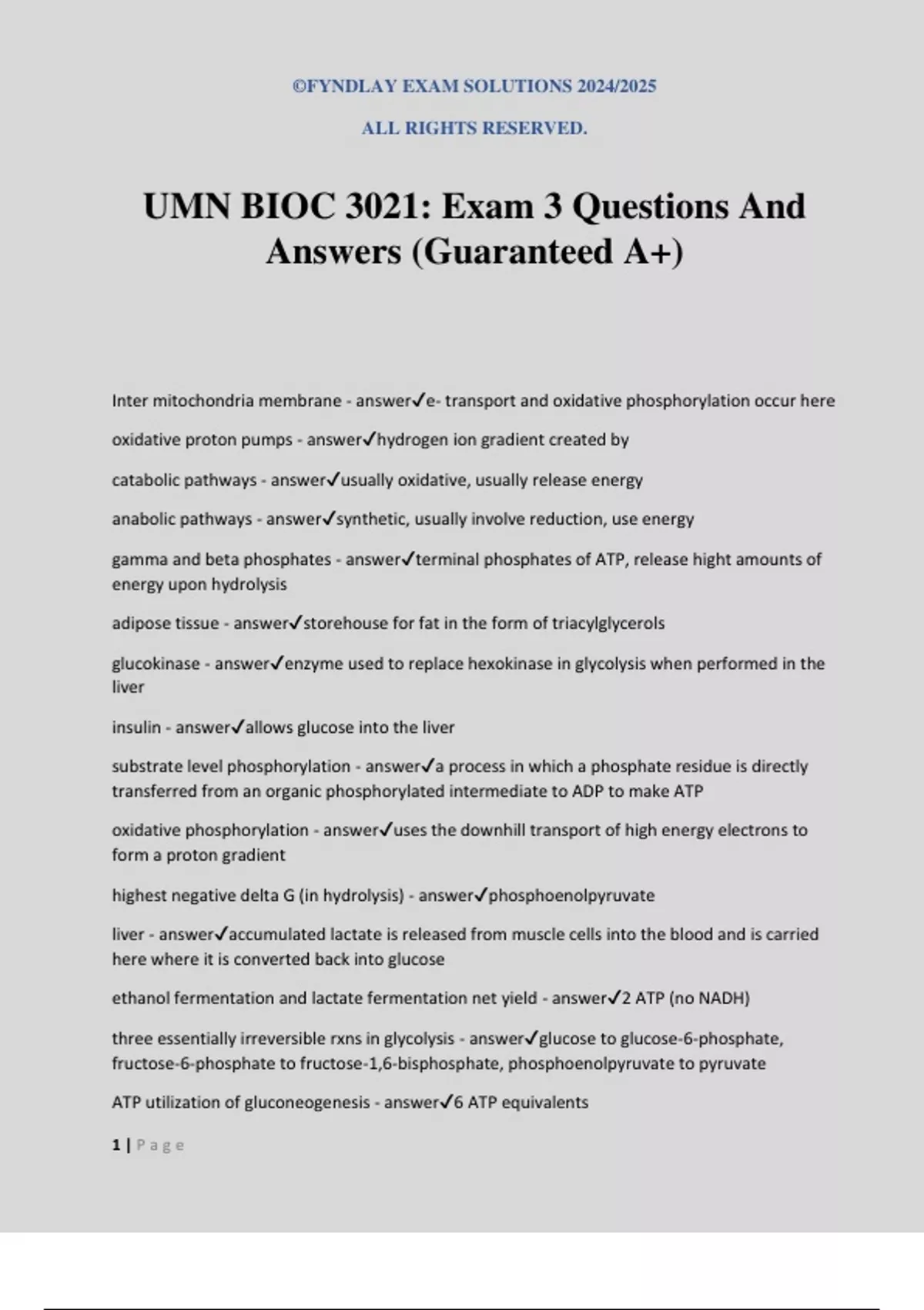 UMN BIOC 3021: Exam 3 Questions And Answers (Guaranteed A+)