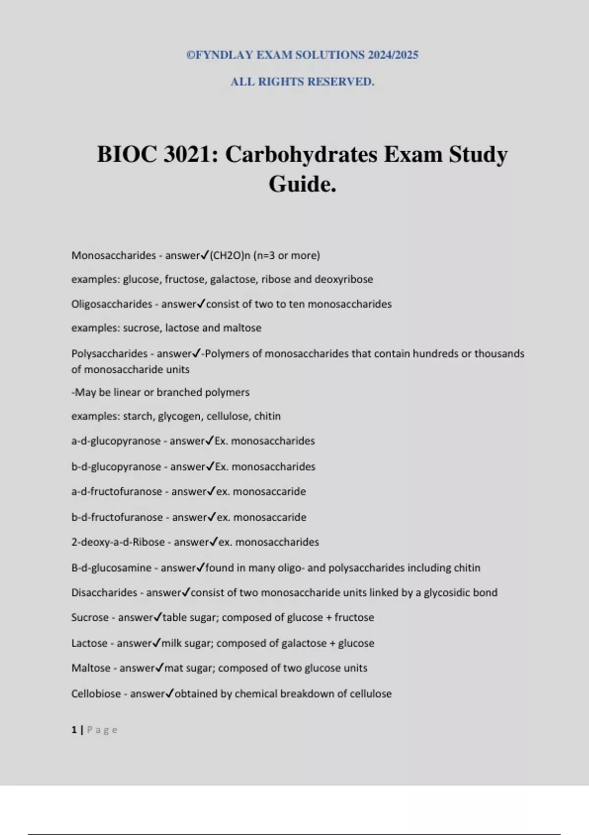 ©FYNDLAY EXAM SOLUTIONS 2024/2025 ALL RIGHTS RESERVED. 1 | P a g e BIOC 3021: Carbohydrates Exam Study Guide. Monosaccharides - answer(CH2O)n (n=3 or more) examples: glucose, fructose, galactose, ribose and deoxyribose Oligosaccharides - answerconsist of two to ten monosaccharides examples: sucrose, lactose and maltose Polysaccharides - answer-Polymers of monosaccharides that contain hundreds or thousands of monosaccharide units -May be linear or branched polymers examples: starch, glycogen, cellulose, chitin a-d-glucopyranose - answerEx. monosaccharides b-d-glucopyranose - answerEx. monosaccharides a-d-fructofuranose - answerex. monosaccaride b-d-fructofuranose - answerex. monosaccaride 2-deoxy-a-d-Ribose - answerex. monosaccharides B-d-glucosamine - answerfound in many oligo- and polysaccharides including chitin Disaccharides - answerconsist of two monosaccharide units linked by a glycosidic bond Sucrose - answertable sugar; composed of glucose + fructose Lactose - answermilk sugar; composed of galactose + glucose Maltose - answermat sugar; composed of two glucose units Cellobiose - answerobtained by chemical breakdown of cellulose