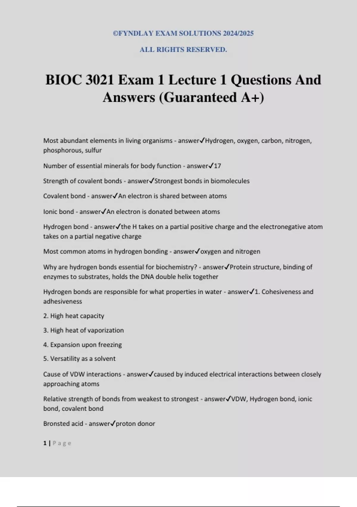 ©FYNDLAY EXAM SOLUTIONS 2024/2025 ALL RIGHTS RESERVED. 1 | P a g e BIOC 3021 Exam 1 Lecture 1 Questions And Answers (Guaranteed A+) Most abundant elements in living organisms - answerHydrogen, oxygen, carbon, nitrogen, phosphorous, sulfur Number of essential minerals for body function - answer17 Strength of covalent bonds - answerStrongest bonds in biomolecules Covalent bond - answerAn electron is shared between atoms Ionic bond - answerAn electron is donated between atoms Hydrogen bond - answerthe H takes on a partial positive charge and the electronegative atom takes on a partial negative charge Most common atoms in hydrogen bonding - answeroxygen and nitrogen Why are hydrogen bonds essential for biochemistry? - answerProtein structure, binding of enzymes to substrates, holds the DNA