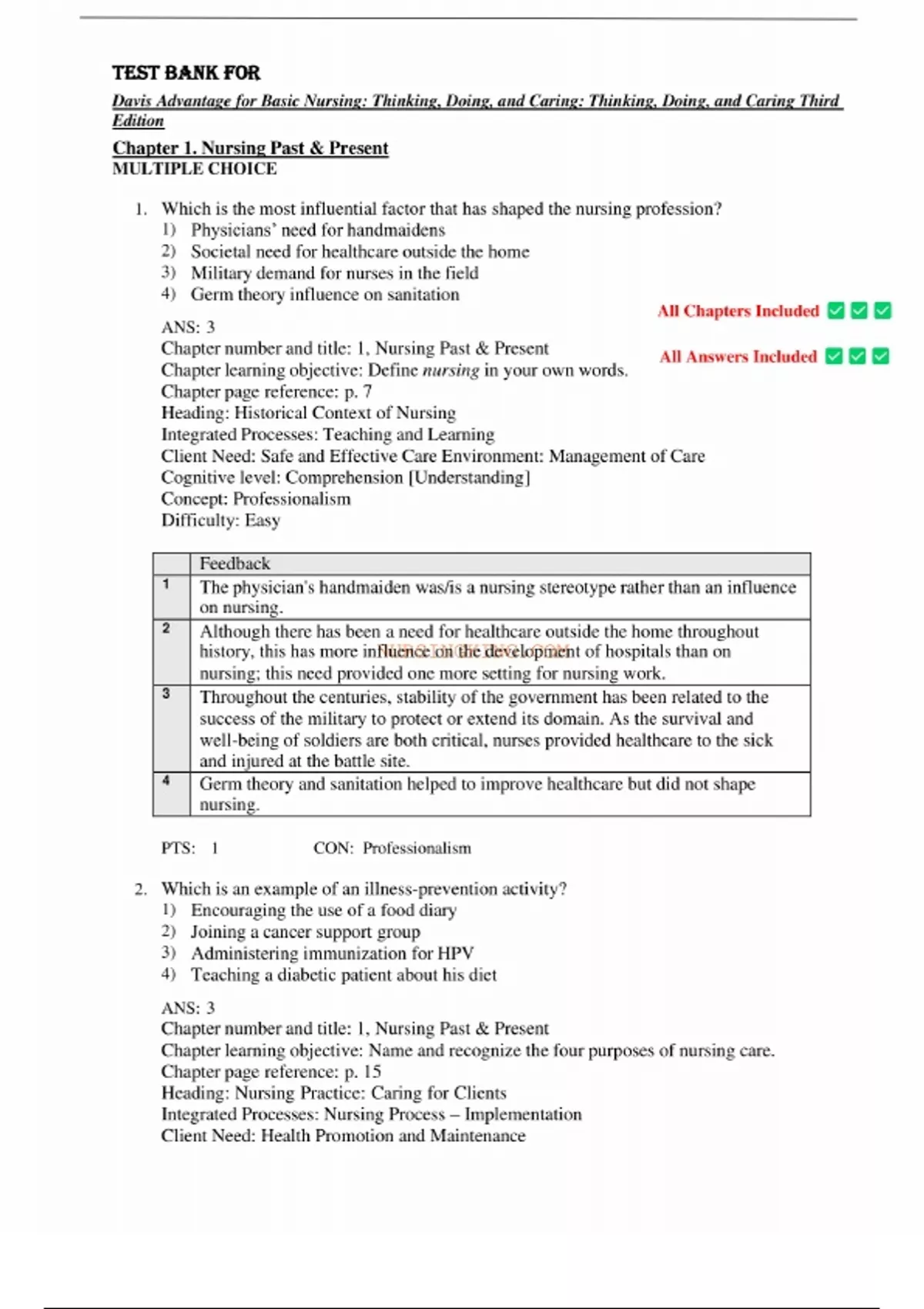 Test Bank for Davis Advantage for Basic Nursing: Thinking, Doing, and Caring: Thinking, Doing, and Caring Third Edition (Treas, 2021), Chapter 1-46 | All Chapters