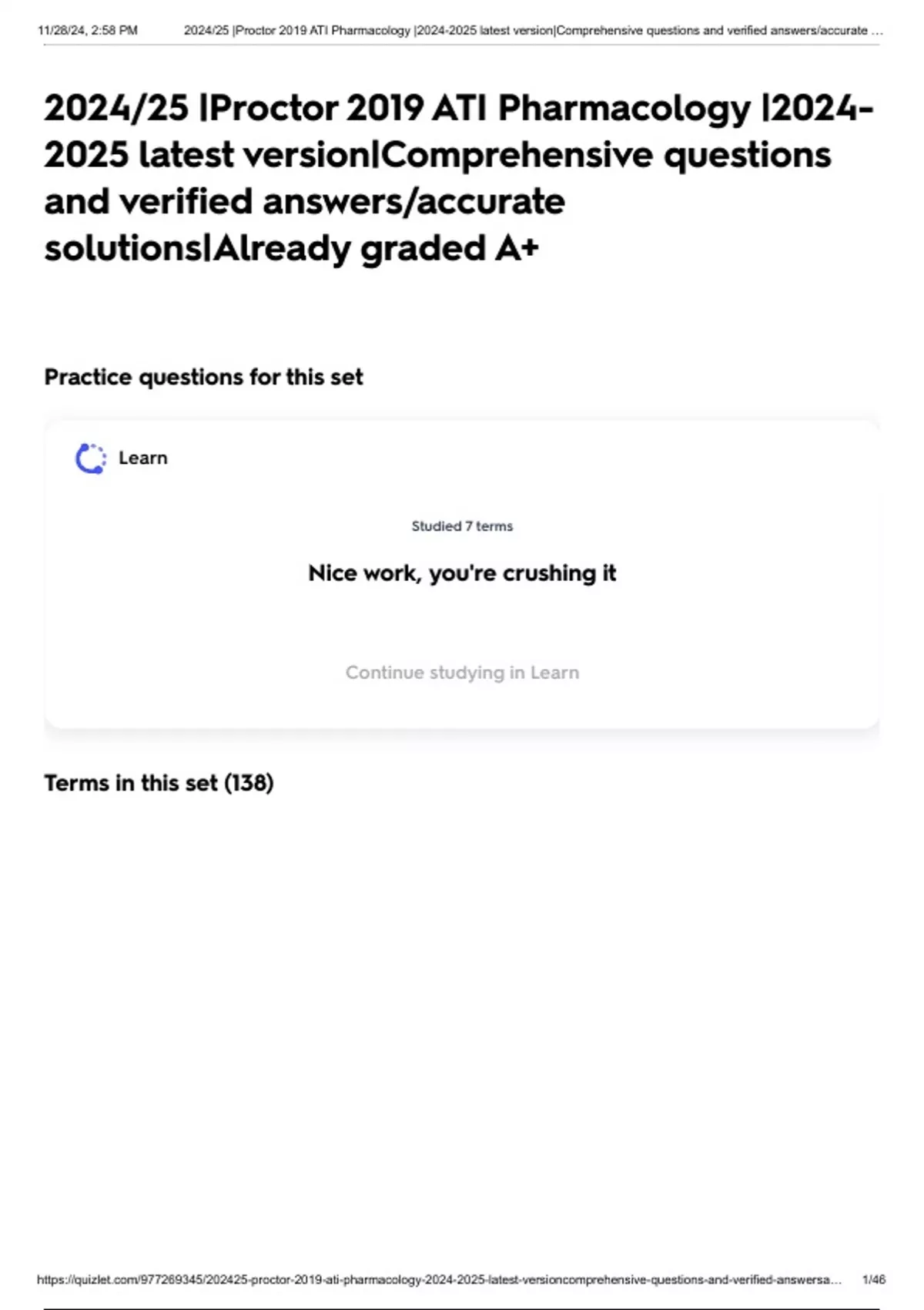 , 11/28/24, 2:58 PM 2024/25 |Proctor 2019 ATI Pharmacology |2024-2025 latest version|Comprehensive questions and verified answers/accurate …