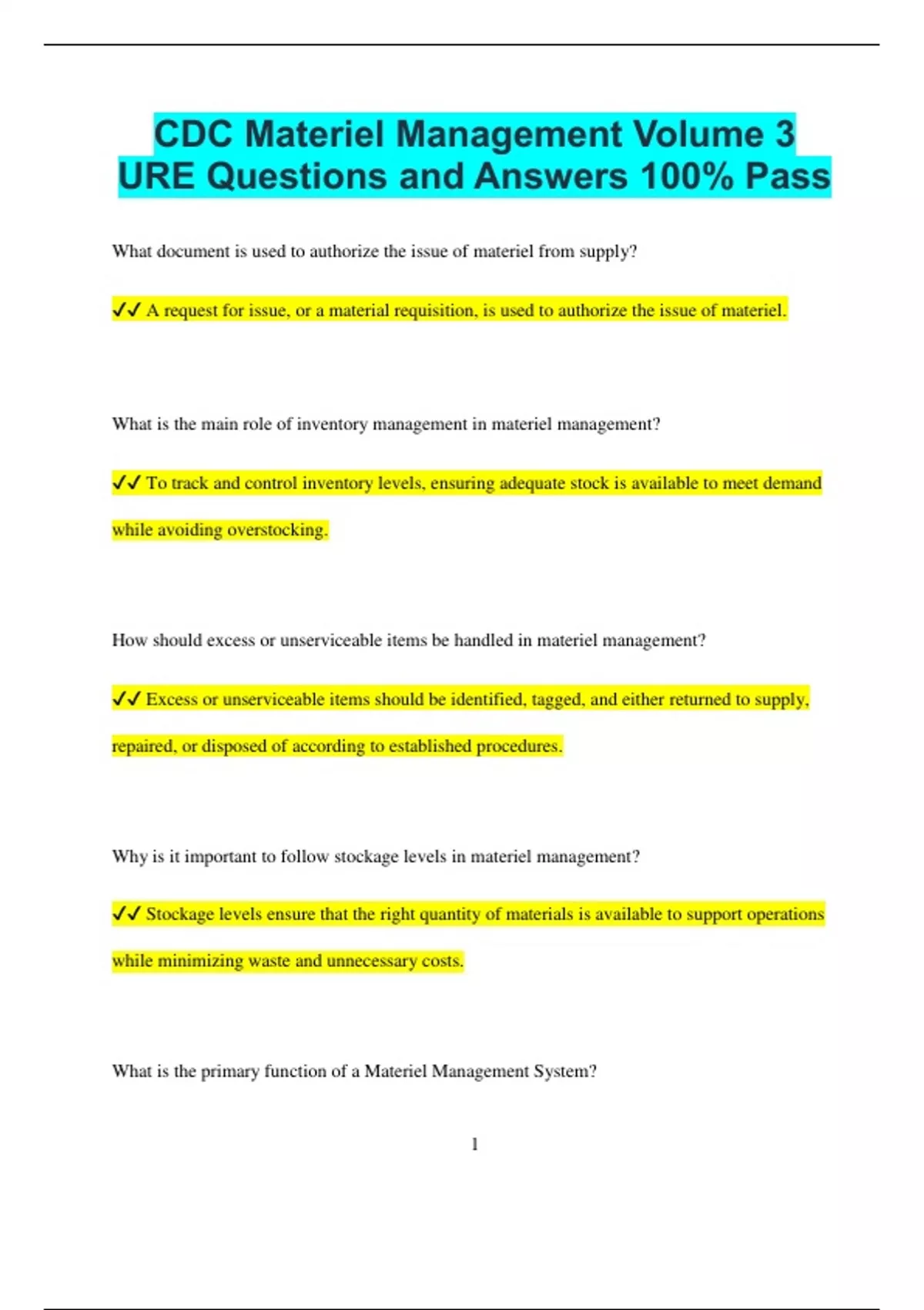 CDC Materiel Management Volume 3 URE Questions and Answers 100% Pass What document is used to authorize the issue of materiel from supply? A request for issue, or a material requisition, is used to authorize the issue of materiel. What is the main role of inventory management in materiel management? To track and control inventory levels, ensuring adequate stock is available to meet demand while avoiding overstocking. How should excess or unserviceable items be handled in materiel management? Excess or unserviceable items should be identified, tagged, and either returned to supply, repaired, or disposed of according to established procedures. Why is it important to follow stockage levels in materiel management? Stockage levels ensure that the right quantity of materials is available to support operations while minimizing waste and unnecessary costs. What is the primary function of a Materiel Management System? 2 To ensure the effective distribution, tracking, and management of all materials necessary for mission success. What is the purpose of conducting a physical inventory in materiel management? To verify the accuracy of inventory records and ensure that the actual stock levels match the records in the system. What is a major goal of asset management within materiel management? To optimize the lifecycle of assets, ensuring that they are available when needed and properly maintained to avoid premature failure. What action should be taken when a discrepancy is found between inventory records and physical stock? The discrepancy should be investigated, corrected in the system, and proper documentation should be filed for audit and accountability purposes. How are items categorized in a materiel management system? Items are categorized based on their classification, demand, and criticality to operations. 3 What is the role of a materiel management specialist in managing excess items? The specialist is responsible for identifying excess items, determining their disposition, and ensuring proper documentation and disposal or redistribution. What is the primary responsibility when receiving a shipment of supplies? To verify the accuracy of the shipment against the order, inspect for damage, and properly store items in designated locations. Why is it necessary to conduct regular stock checks in a materiel management system? Regular stock checks help maintain accurate inventory records, reduce errors, and ensure that necessary items are available for use. What is the significance of controlling sensitive items in materiel management? Sensitive items must be carefully tracked and safeguarded to prevent theft or misuse, and to maintain accountability. What is the purpose of the document register in materiel management? The document register records all transactions related to the receipt, storage, and distribution of materials to maintain an accurate audit trail. 4 How does the materiel management system ensure the proper handling of hazardous materials? Hazardous materials are stored in specific areas, handled with care, and accompanied by the correct documentation, ensuring compliance with safety regulations. What is the role of a stock control clerk in the materiel management process? A stock control clerk is responsible for maintaining