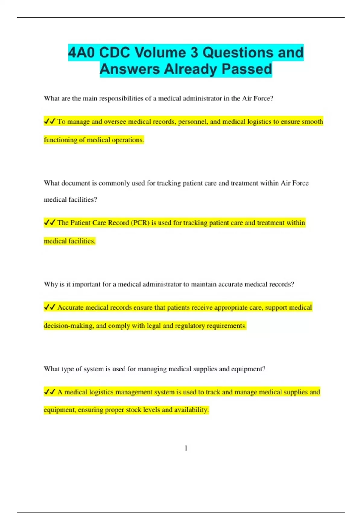 4A0 CDC Volume 3 Questions and Answers Already Passed What are the main responsibilities of a medical administrator in the Air Force? To manage and oversee medical records, personnel, and medical logistics to ensure smooth functioning of medical operations. What document is commonly used for tracking patient care and treatment within Air Force medical facilities? The Patient Care Record (PCR) is used for tracking patient care and treatment within medical facilities. Why is it important for a medical administrator to maintain accurate medical records? Accurate medical records ensure that patients receive appropriate care, support medical decision-making, and comply with legal and regulatory requirements. What type of system is used for managing medical supplies and equipment? A medical logistics management system is used to track and manage medical supplies and equipment, ensuring proper stock levels and availability. 2 What is the purpose of medical coding in the Air Force? Medical coding is used to classify and document medical diagnoses and procedures, ensuring accurate billing and record-keeping. How does a medical administrator handle patient confidentiality? Patient confidentiality is maintained by following HIPAA guidelines, ensuring that personal health information is securely stored and shared only with authorized individuals. What is the role of a medical administrator in scheduling patient appointments? A medical administrator is responsible for scheduling patient appointments, ensuring that patients are seen in a timely manner and according to medical priorities. How should a medical administrator handle incoming patient referrals? Incoming patient referrals should be reviewed, verified, and properly documented to ensure they are directed to the appropriate department or provider. What is the importance of the Defense Medical Logistics Standard Support (DMLSS) system in the Air Force? 3 The DMLSS system is used to manage medical logistics, including the ordering, tracking, and distribution of medical supplies and equipment. What steps should be taken if there is a discrepancy in a patient’s medical record? The discrepancy should be identified, corrected, and properly documented to maintain accurate patient records and ensure proper treatment. How is patient care data used in medical administration? Patient care data is used for tracking treatment progress, managing appointments, ensuring compliance with medical protocols, and providing information for billing purposes. What are the responsibilities of a medical administrator when managing medical personnel? Responsibilities include ensuring proper training, assigning tasks, tracking performance, and managing staffing levels to meet operational needs. What is the role of a medical administrator in the referral process? The medical administrator ensures that referrals are processed efficiently, sent to the appropriate medical specialists, and followed up on to ensure timely care. 4 What should be done if there is an issue with medical billing? The issue should be reviewed, corrected, and communicated with the appropriate department to ensure accurate and timely billing. What is the role of a medical administrator in handling medical evacuations? A medical administrator coordinates the logistics, documentation, and necessary approvals for medical evacuations to ensure patients are transferred