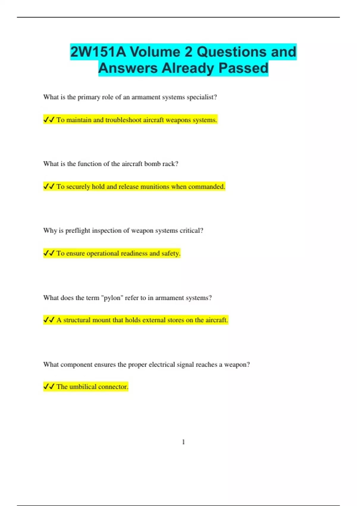 2W151A Volume 2 Questions and Answers Already Passed What is the primary role of an armament systems specialist? To maintain and troubleshoot aircraft weapons systems. What is the function of the aircraft bomb rack? To securely hold and release munitions when commanded. Why is preflight inspection of weapon systems critical? To ensure operational readiness and safety. What does the term "pylon" refer to in armament systems? A structural mount that holds external stores on the aircraft. What component ensures the proper electrical signal reaches a weapon? The umbilical connector. 2 Why is torque measurement important during weapon system assembly? To ensure components are securely fastened to specifications. What is the function of a missile rail launcher? To guide the missile during deployment from the aircraft. What type of power does the aircraft generator provide for weapons systems? Electrical power. Why is grounding necessary during munitions loading? To prevent static electricity from igniting explosives. What is a safety pin used for in weapons systems? To prevent accidental activation of munitions. What does a firing circuit test verify? The continuity and functionality of the electrical firing system. 3 What is the purpose of the breech mechanism in a gun system? To load and chamber rounds for firing. Why is alignment of bomb racks checked regularly? To ensure accurate weapon release during missions. What component on an aircraft secures external fuel tanks? A suspension lug. What is a common material used for aircraft gun barrels? High-strength steel. Why are thermal protective coatings applied to munitions? To prevent detonation due to high temperatures. What type of inspection ensures munitions compatibility with aircraft? A fit-check inspection. 4 Why is the use of personal protective equipment (PPE) important during weapons maintenance? To protect technicians from hazards like chemicals or sharp components. What is the purpose of the arming solenoid in a weapon system? To activate the arming sequence of a munition. What is the function of an impulse cartridge in a bomb ejector rack? To provide the force needed to release a bomb from the rack. Why must weapons systems be lubricated regularly? To reduce wear and ensure smooth operation. What is a critical step in troubleshooting a malfunctioning missile launcher? Checking the electrical continuity of the launcher. What does an ordnance control panel allow the pilot to do? Select and release weapons during flight.
