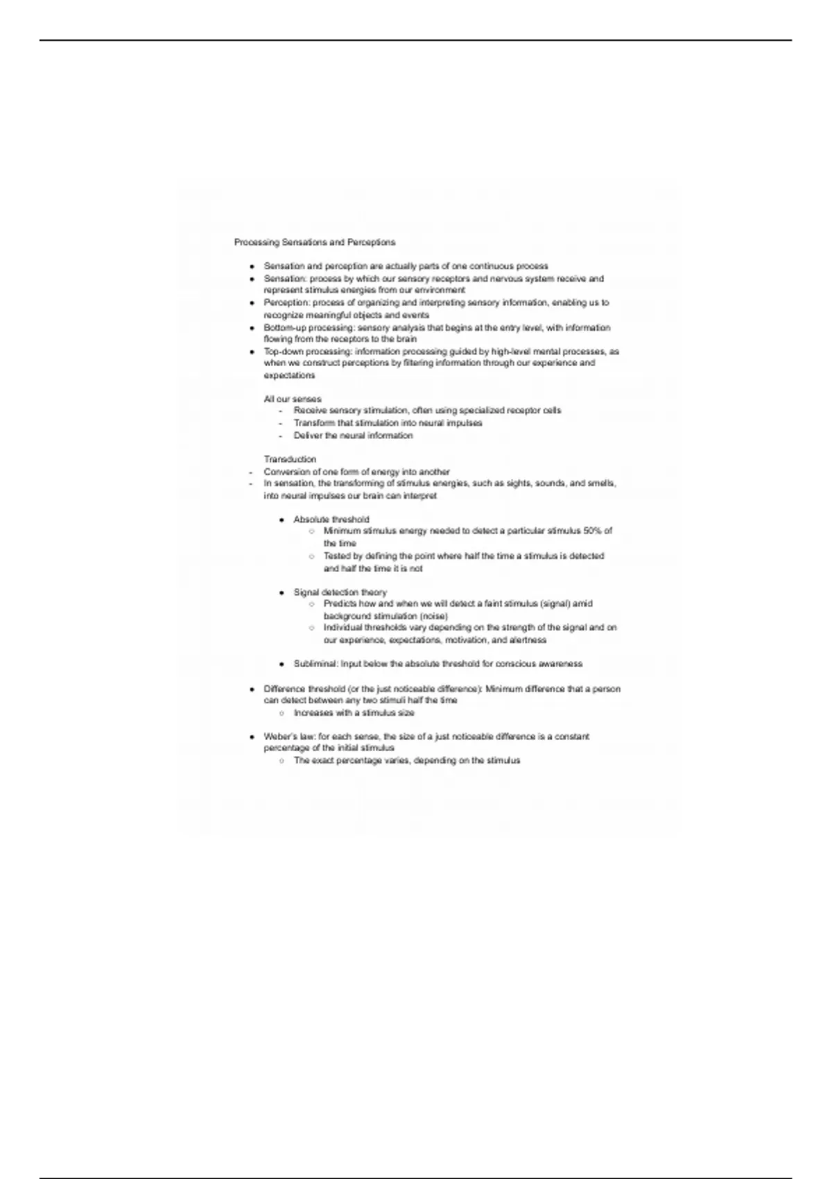 ● Sensation: process by which our sensory receptors and nervous system receive and