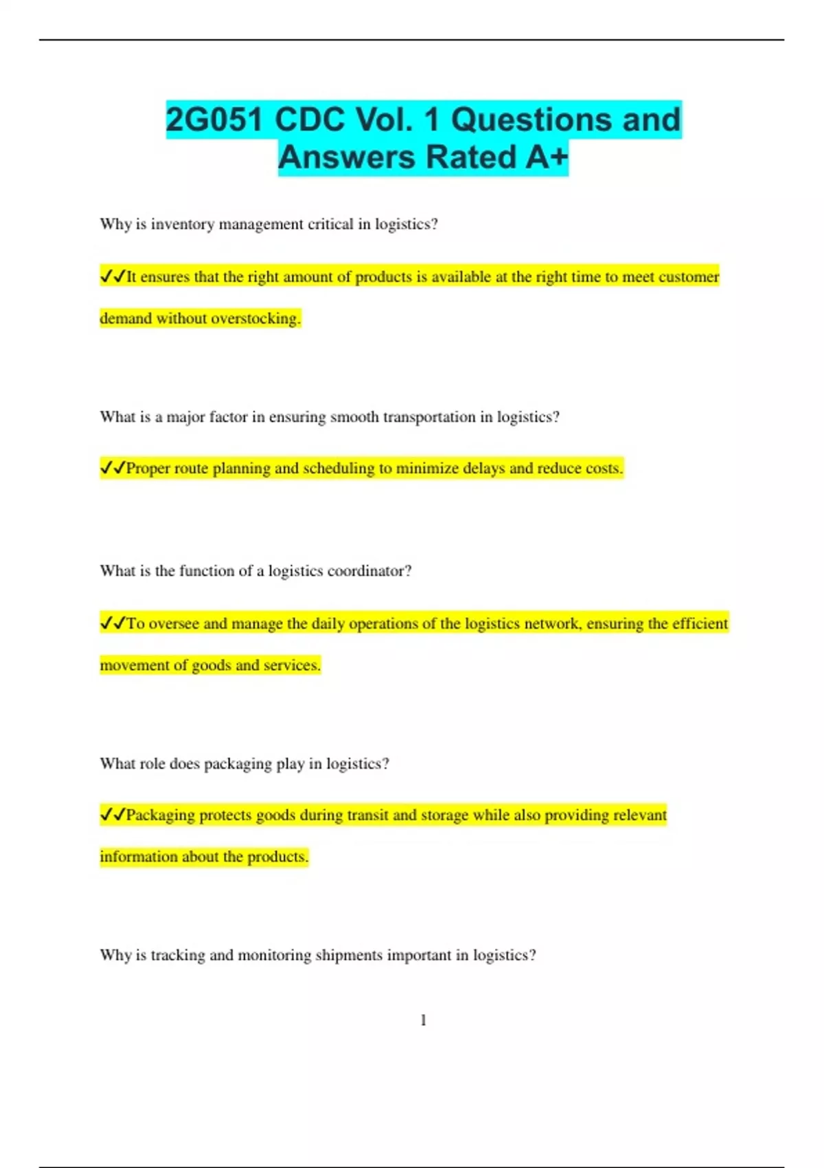 2G051 CDC Vol. 1 Questions and Answers Rated A+ Why is inventory management critical in logistics? It ensures that the right amount of products is available at the right time to meet customer demand without overstocking. What is a major factor in ensuring smooth transportation in logistics? Proper route planning and scheduling to minimize delays and reduce costs. What is the function of a logistics coordinator? To oversee and manage the daily operations of the logistics network, ensuring the efficient movement of goods and services. What role does packaging play in logistics? Packaging protects goods during transit and storage while also providing relevant information about the products. Why is tracking and monitoring shipments important in logistics? 2 It helps to ensure timely delivery, manage risks, and provide accurate updates to customers. What is the significance of demand forecasting in logistics? It helps in predicting the future demand for products, allowing logistics teams to plan inventory and transportation accordingly. What is “last mile delivery” in the logistics process? The final step of the delivery process where goods are transported from a transportation hub to the final destination. What is a 3PL (Third-Party Logistics) provider? A company that manages and executes logistics functions on behalf of other companies, such as warehousing and transportation. Why is warehouse management essential for logistics? Effective warehouse management ensures the proper storage, handling, and quick retrieval of goods, minimizing delays in distribution. How does technology impact modern logistics? 3 It improves efficiency, accuracy, and real-time tracking of goods through automation, GPS, and inventory management systems. What is cross-docking in logistics? The practice of unloading goods from incoming transportation and directly loading them onto outbound transportation with little or no storage in between. What is a Bill of Lading (BOL)? A legal document that serves as a receipt for goods and outlines the terms of transportation between the shipper and the carrier. How does route optimization improve logistics operations? By selecting the most efficient routes, it reduces transportation costs and delivery times while improving customer satisfaction. What is the role of logistics in inventory replenishment? Logistics ensures that inventory levels are maintained efficiently by managing restocking and order fulfillment processes. 4 Why is risk management important in logistics? It helps mitigate potential disruptions caused by unforeseen events such as natural disasters, accidents, or supply chain breakdowns.