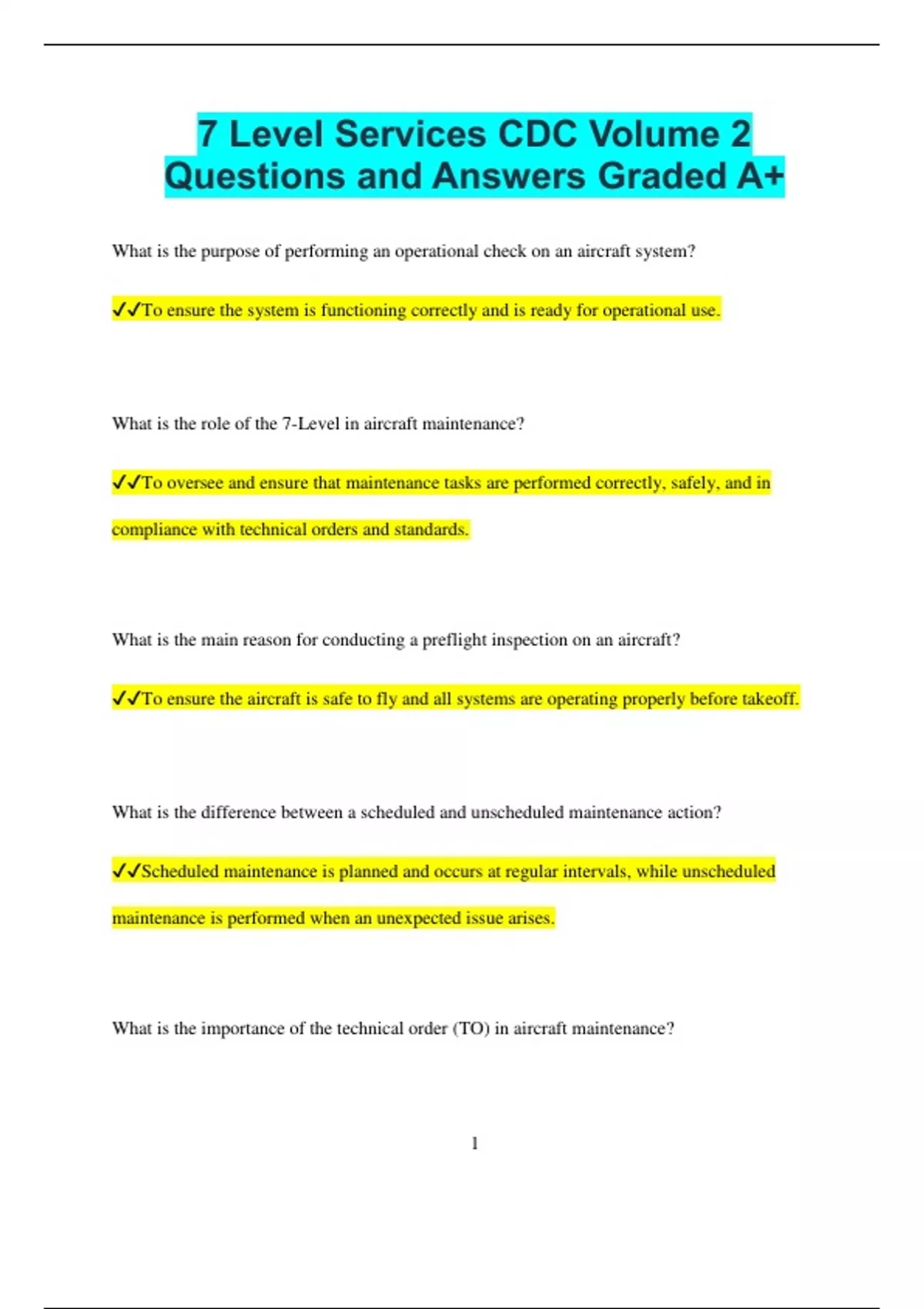 7 Level Services CDC Volume 2 Questions and Answers Graded A+ What is the purpose of performing an operational check on an aircraft system? To ensure the system is functioning correctly and is ready for operational use. What is the role of the 7-Level in aircraft maintenance? To oversee and ensure that maintenance tasks are performed correctly, safely, and in compliance with technical orders and standards. What is the main reason for conducting a preflight inspection on an aircraft? To ensure the aircraft is safe to fly and all systems are operating properly before takeoff. What is the difference between a scheduled and unscheduled maintenance action? Scheduled maintenance is planned and occurs at regular intervals, while unscheduled maintenance is performed when an unexpected issue arises. What is the importance of the technical order (TO) in aircraft maintenance? 2 The TO provides detailed, step-by-step instructions for maintaining, troubleshooting, and repairing aircraft systems and components. What is the role of a 7-Level when performing troubleshooting procedures? To use diagnostic tools and procedures to identify and resolve problems with aircraft systems. Why is it important to follow safety protocols during aircraft maintenance? Safety protocols protect maintenance personnel from accidents and ensure the safety and readiness of the aircraft. What should be done if an aircraft component is found to be out of specification during an inspection? The component should be repaired, replaced, or documented for further action based on the aircraft’s maintenance schedule. How do maintenance records contribute to aircraft readiness? Maintenance records provide a documented history of repairs, inspections, and modifications, ensuring the aircraft is ready for safe operation. 3 What is the responsibility of the 7-Level when it comes to supervising junior personnel? To mentor, guide, and ensure junior personnel are trained and performing tasks correctly and efficiently. How is the effectiveness of a repair procedure determined? The effectiveness of a repair is verified by conducting operational checks or tests to confirm the problem is resolved.