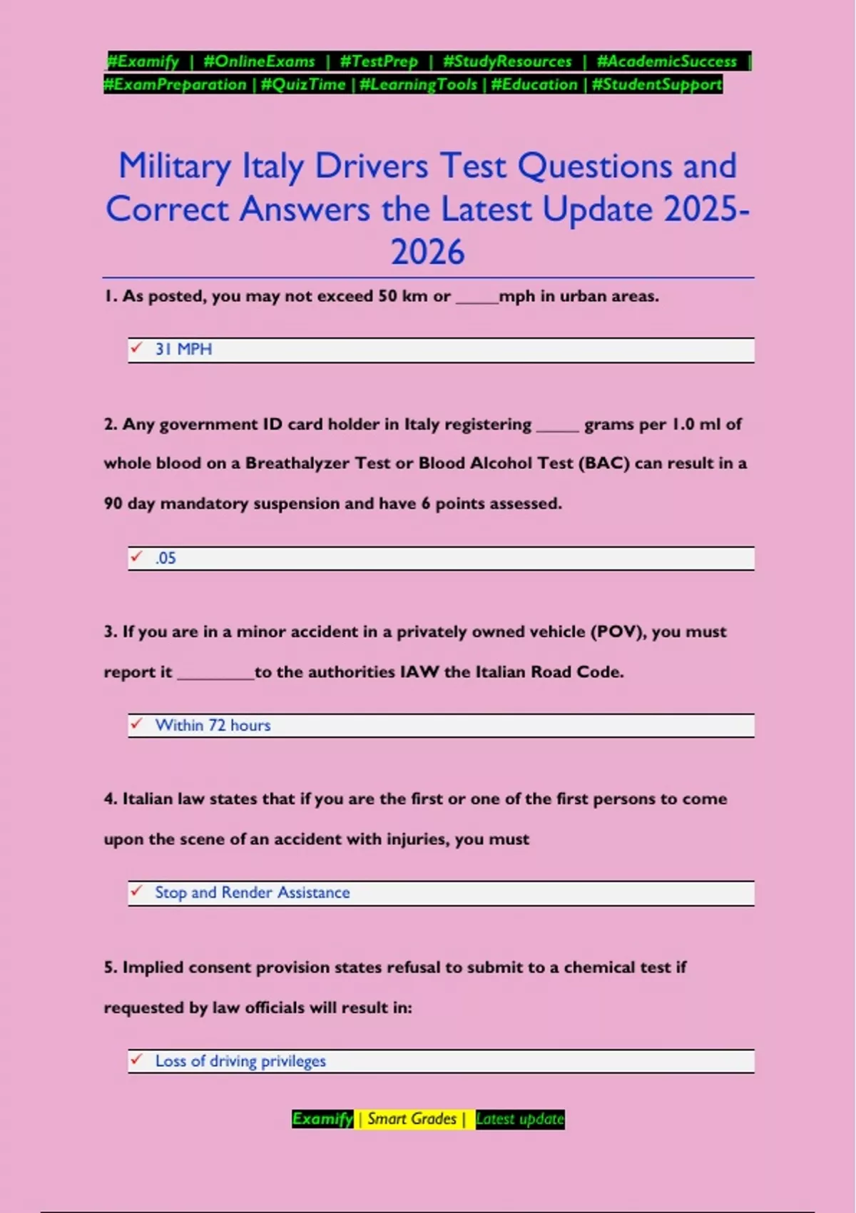Military Italy Drivers Test Questions and Correct Answers the Latest Update 2025- 202