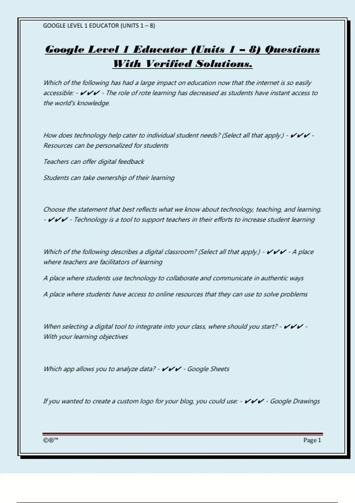 Google Level 1 Educator (Units 1 – 8) Questions With Verified Solutions.