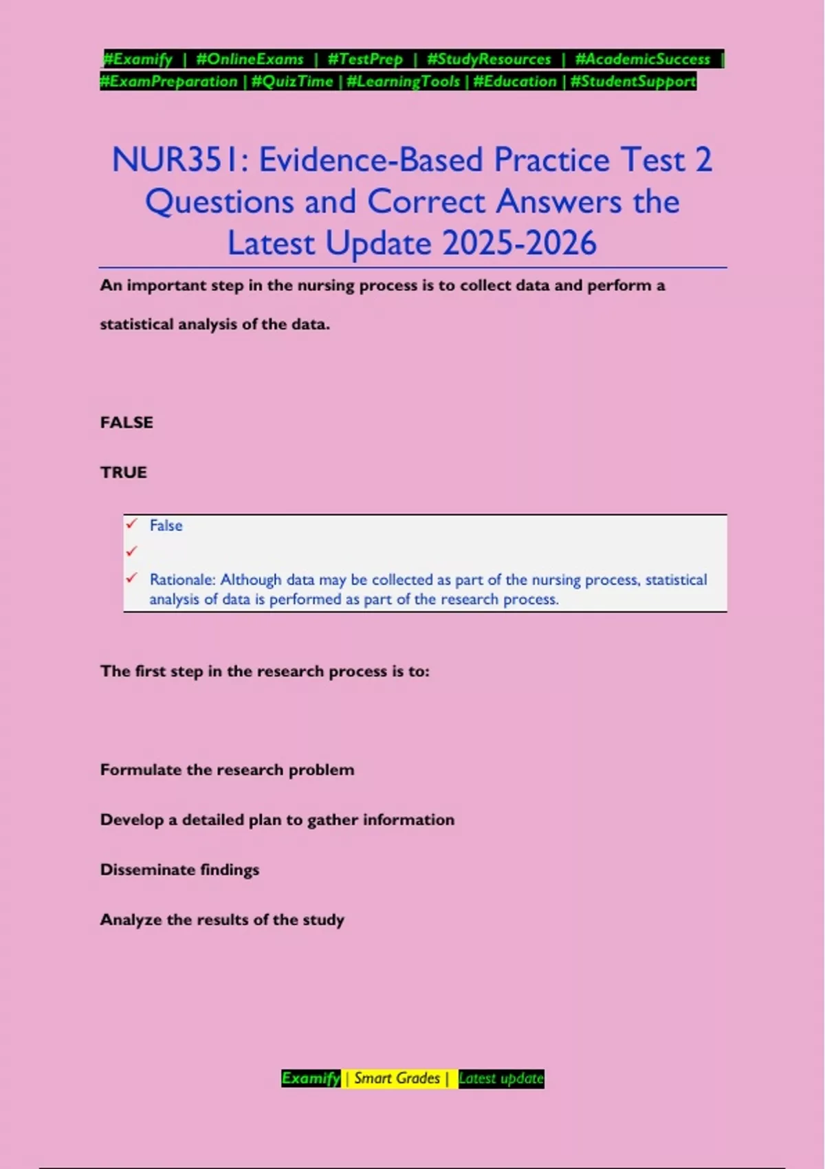 NUR351: Evidence-Based Practice Test 2 Questions and Correct Answers the Latest Update 2025-202