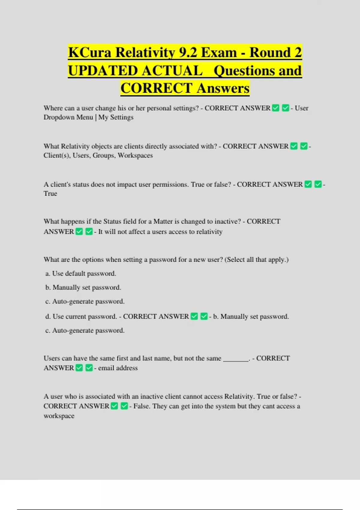 KCura Relativity 9.2 Exam - Round 2 UPDATED ACTUAL Questions and CORRECT Answers Where can a user change his or her personal settings? - CORRECT ANSWER - User Dropdown Menu | My Settings What Relativity objects are clients directly associated with? - CORRECT ANSWER - Client(s), Users, Groups, Workspace