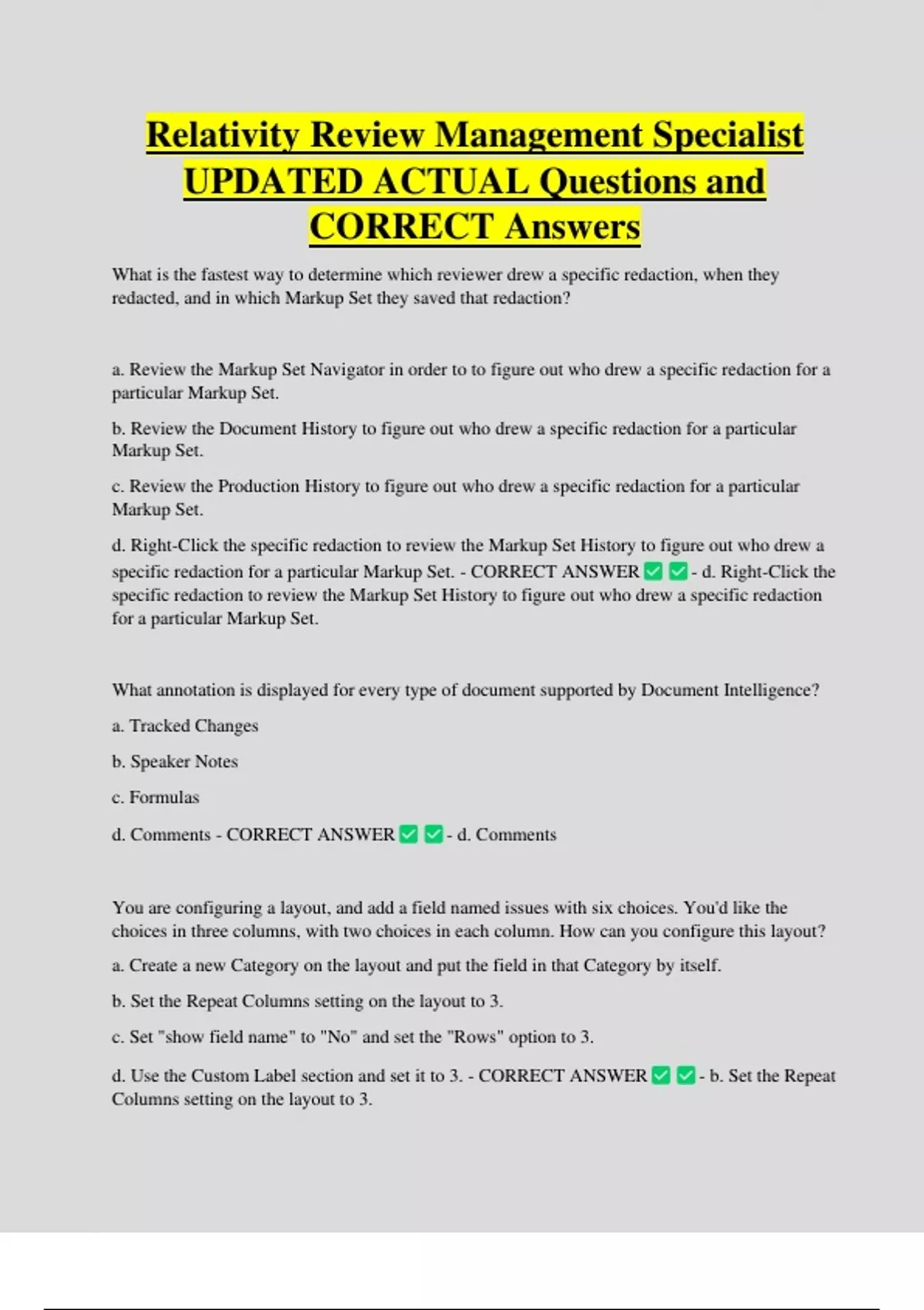 specific redaction for a particular Markup Set. - CORRECT ANSWER - d. Right-Click the