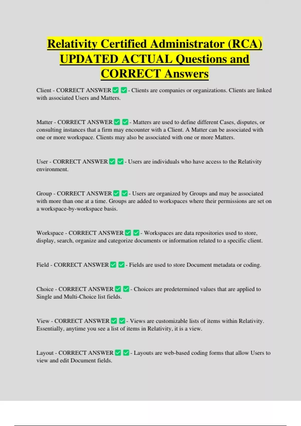 Relativity Certified Administrator (RCA) UPDATED ACTUAL Questions and CORRECT Answers Client - CORRECT ANSWER - Clients are companies or organizations. Clients are linked with associated Users and Matters. Matter - CORRECT ANSWER - Matters are used to define different Cases, disputes, or consulting instances that a firm may encounter with a Client. A Matter can be associated with one or more workspace. Clients may also be associated with one or more Matters