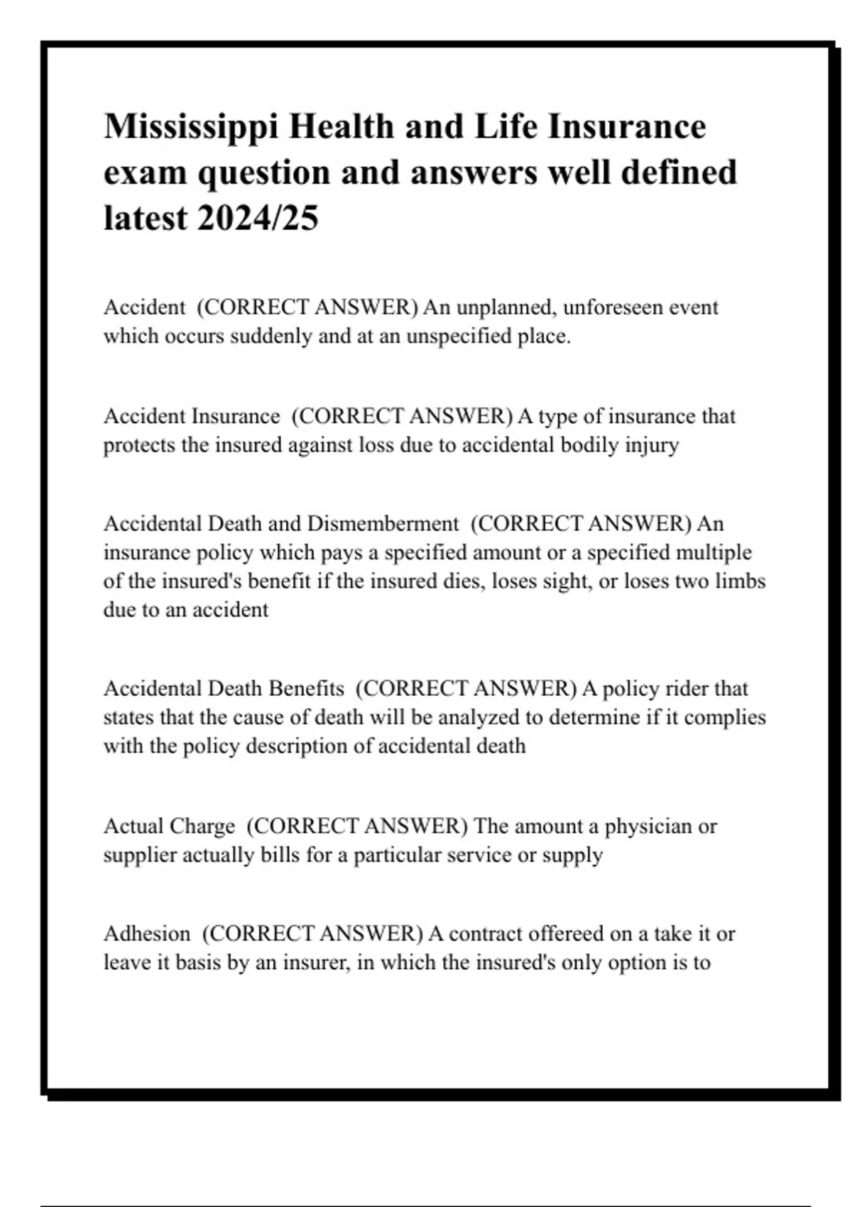 Accidental Death and Dismemberment (CORRECT ANSWER) An