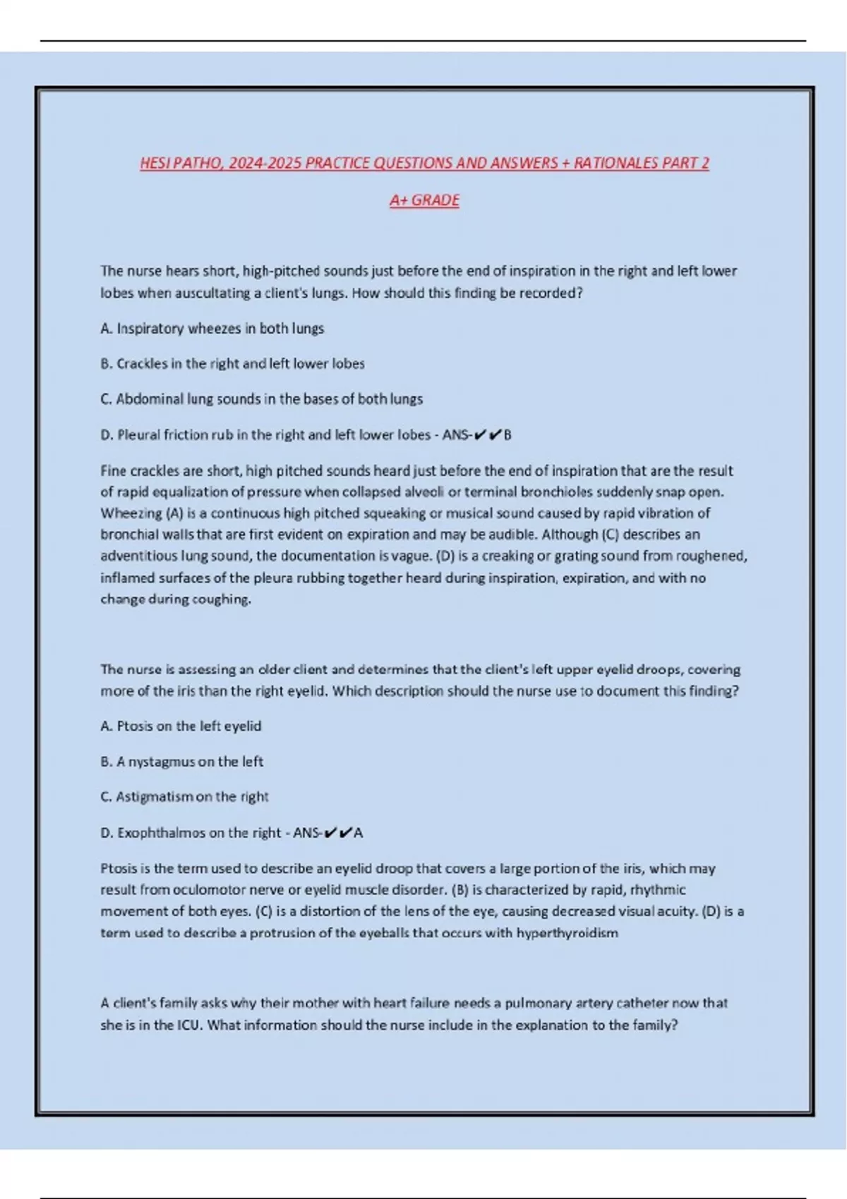 HESI PATHO, PRACTICE QUESTIONS AND ANSWERS + RATIONALES PART 2 A+ GRADE The nurse hears short, high-pitched sounds just before the end of inspiration in the right and left lower lobes when auscultating a client's lungs. How should this finding be recorded? A. Inspiratory wheezes in both lungs B. Crackles in the right and left lower lobes C. Abdominal lung sounds in the bases of both lungs D. Pleural friction rub in the right and left lower lobes - ANS-B Fine crackles are short, high pitched sounds heard just before the end of inspiration that are the result of rapid equalization of pressure when collapsed alveoli or terminal bronchioles suddenly snap open. Wheezing (A) is a continuous high pitched squeaking or musical sound caused by rapid vibration of bronchial walls that are first evident on expiration and may be audible. Although (C) describes an adventitious lung sound, the documentation is vague. (D) is a creaking or grating sound from roughened, inflamed surfaces of the pleura rubbing together heard during inspiration, expiration, and with no change during coughing. The nurse is assessing an older client and determines that the client's left upper eyelid droops, covering more of the iris than the right eyelid. Which description should the nurse use to document this finding? A. Ptosis on the left eyelid B. A nystagmus on the left C. Astigmatism on the right D. Exophthalmos on the right - ANS-A Ptosis is the term used to describe an eyelid droop that covers a large portion of the iris, which may result from oculomotor nerve or eyelid muscle disorder. (B) is characterized by rapid, rhythmic movement of both eyes. (C) is a distortion of the lens of the eye, causing decreased visual acuity. (D) is a term used to describe a protrusion of the eyeballs that occurs with hyperthyroidism A client's family asks why their mother with heart failure needs a pulmonary artery catheter now that she is in the ICU. What information should the nurse include in the explanation to the family? CONTINUES...
