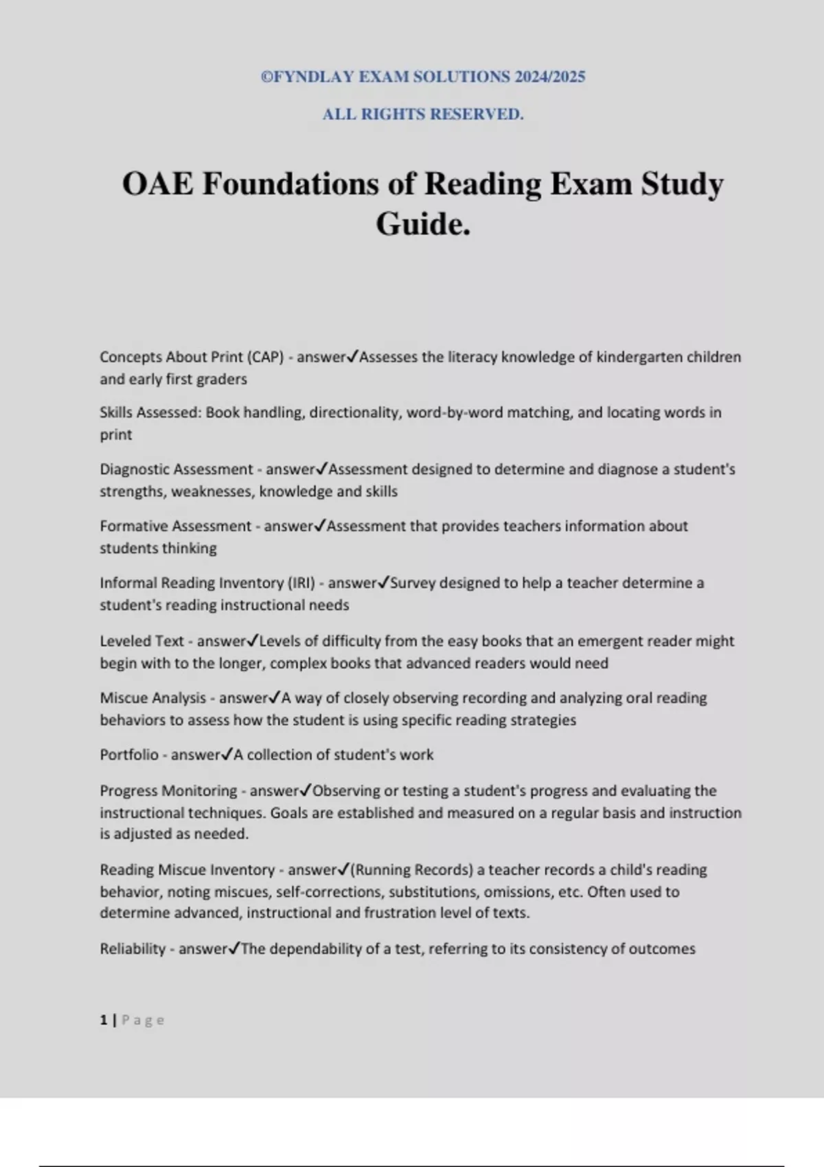 ©FYNDLAY EXAM SOLUTIONS 2024/2025 ALL RIGHTS RESERVED. 1 | P a g e OAE Foundations of Reading Exam Study Guide. Concepts About Print (CAP) - answerAssesses the literacy knowledge of kindergarten children and early first graders Skills Assessed: Book handling, directionality, word-by-word matching, and locating words in print Diagnostic Assessment - answerAssessment designed to determine and diagnose a student's strengths, weaknesses, knowledge and skills Formative Assessment - answerAssessment that provides teachers information about students thinking Informal Reading Inventory (IRI) - answerSurvey designed to help a teacher determine a student's reading instructional needs Leveled Text - answerLevels of difficulty from the easy books that an emergent reader might begin with to the longer, complex books that advanced readers would need Miscue Analysis - answerA way of closely observing recording and analyzing oral reading behaviors to assess how the student is using specific reading strategies Portfolio - answerA collection of student's work Progress Monitoring - answerObserving or testing a student's progress and evaluating the instructional techniques. Goals are established and measured on a regular basis and instruction is adjusted as needed. Reading Miscue Inventory - answer(Running Records) a teacher records a child's reading behavior, noting miscues, self-corrections, substitutions, omissions, etc. Often used to determine advanced, instructional and frustration level of texts. Reliability - answerThe dependability of a test, referring to its consistency of outcomes