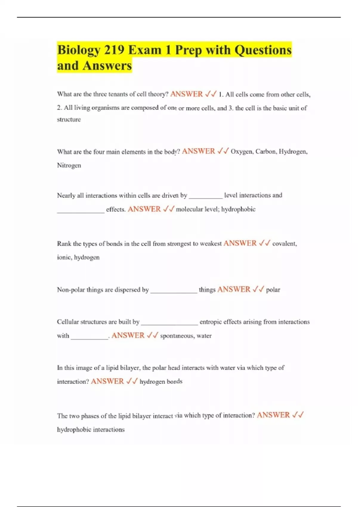 Biology 219 Exam 1 Prep with Questions and Answers What are the three tenants of cell theory? ANSWER 1. All cells come from other cells, 2. All living organisms are composed of one or more cells, and 3. the cell is the basic unit of structure What are the four main elements in the body? ANSWER Oxygen, Carbon, Hydrogen, Nitrogen Nearly all interactions within cells are driven by __________ level interactions and ______________ effects. ANSWER molecular level; hydrophobic Rank the types of bonds in the cell from strongest to weakest ANSWER covalent, ionic, hydrogen Non-polar things are dispersed by ______________ things ANSWER polar Cellular structures are built by _________________ entropic effects arising from interactions with ___________. ANSWER spontaneous, water In this image of a lipid bilayer, the polar head interacts with water via which type of interaction? ANSWER hydrogen bonds The two phases of the lipid bilayer interact via which type of interaction? ANSWER hydrophobic interactions