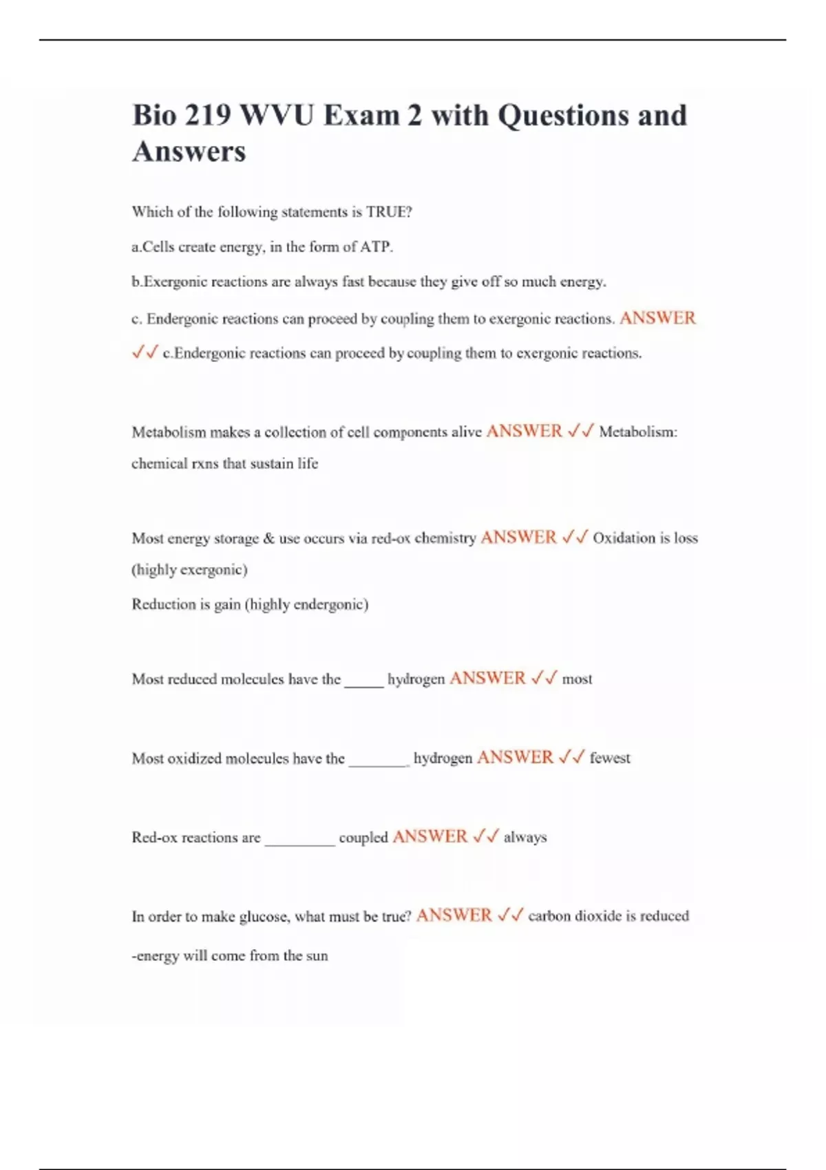 Bio 219 WVU Exam 2 with Questions and Answers Which of the following statements is TRUE? a.Cells create energy, in the form of ATP. b.Exergonic reactions are always fast because they give off so much energy. c. Endergonic reactions can proceed by coupling them to exergonic reactions. ANSWER c.Endergonic reactions can proceed by coupling them to exergonic reactions. Metabolism makes a collection of cell components alive ANSWER Metabolism: chemical rxns that sustain life Most energy storage & use occurs via red-ox chemistry ANSWER Oxidation is loss (highly exergonic) Reduction is gain (highly endergonic) Most reduced molecules have the _____ hydrogen ANSWER most Most oxidized molecules have the ________ hydrogen ANSWER fewest Red-ox reactions are _________ coupled ANSWER always In order to make glucose, what must be true? ANSWER carbon dioxide is reduced -energy will come from the sun