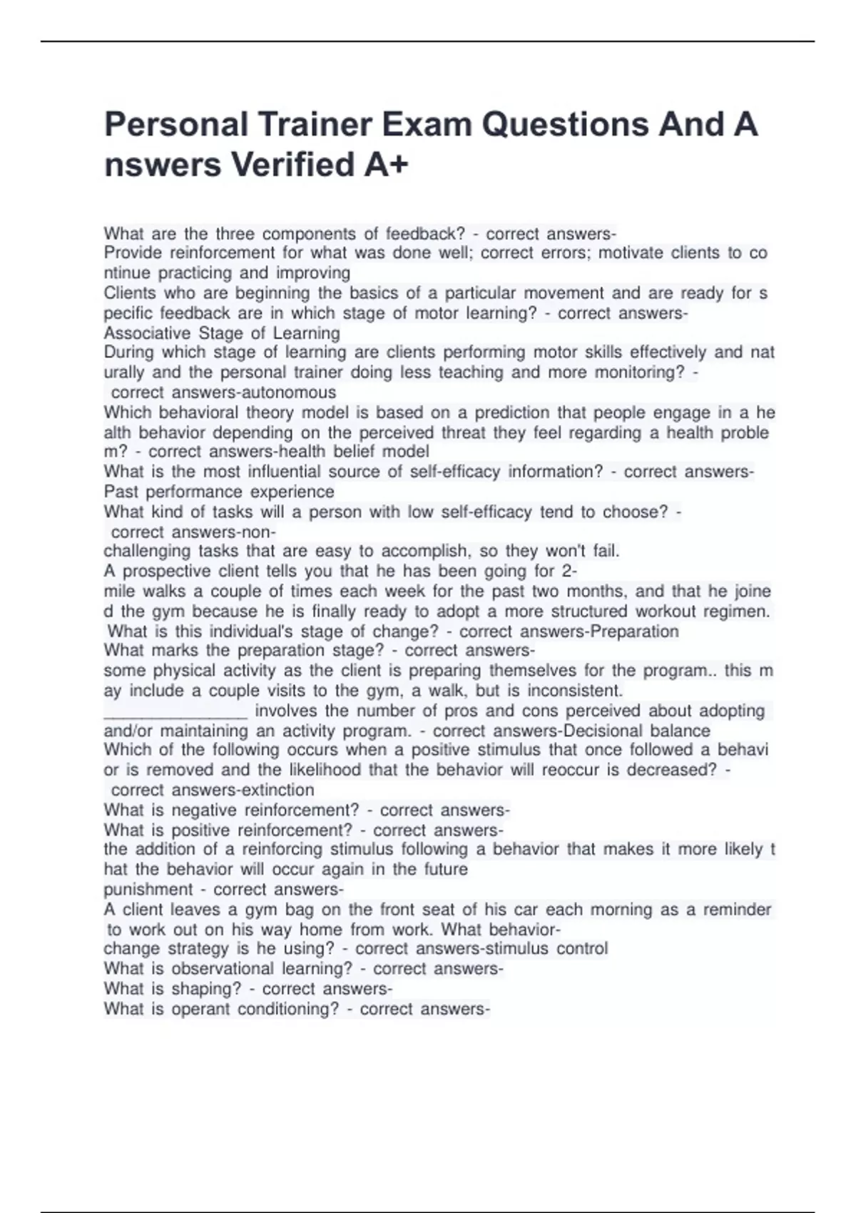 Personal Trainer Exam Questions And Answers Verified A+ What are the three components of feedback? - correct answers-Provide reinforcement for what was done well; correct errors; motivate clients to continue practicing and improving Clients who are beginning the basics of a particular movement and are ready for specific feedback are in which stage of motor learning? - correct answers-Associative Stage of Learning During which stage of learning are clients performing motor skills effectively and naturally and the personal trainer doing less teaching and more monitoring? - correct answers-autonomous Which behavioral theory model is based on a prediction that people engage in a health behavior depending on the perceived threat they feel regarding a health problem? - correct answers-health belief model What is the most influential source of self-efficacy information? - correct answers-Past performance experience What kind of tasks will a person with low self-efficacy tend to choose? - correct answers-non-challenging tasks that are easy to accomplish, so they won't fail. A prospective client tells you that he has been going for 2-mile walks a couple of times each week for the past two months, and that he joined the gym because he is finally ready to adopt a more structured workout regimen. What is this individual's stage of change? - correct answers-Preparation What marks the preparation stage? - correct answers-some physical activity as the client is preparing themselves for the program.. this may include a couple visits to the gym, a walk, but is inconsistent. _______________ involves the number of pros and cons perceived about adopting and/or maintaining an activity program. - correct answers-Decisional balance Which of the following occurs when a positive stimulus that once followed a behavior is removed and the likelihood that the behavior will reoccur is decreased? - correct answers-extinction What is negative reinforcement? - correct answers- What is positive reinforcement? - correct answers-the addition of a reinforcing stimulus following a behavior that makes it more likely that the behavior will occur again in the future punishment - correct answers- A client leaves a gym bag on the front seat of his car each morning as a reminder to work out on his way home from work. What behavior-change strategy is he using? - correct answers-stimulus control What is observational learning? - correct answers- What is shaping? - correct answers- What is operant