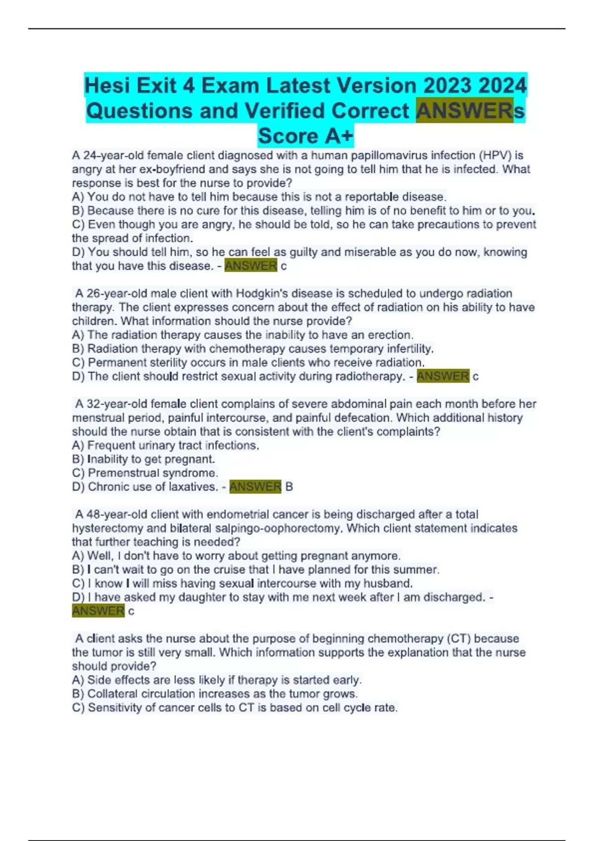 Hesi Exit 4 Exam Latest Version Questions and Verified Correct ANSWERs Score A+Hesi Exit 4 Exam Latest Version Questions and Verified Correct ANSWERs Score A+Hesi Exit 4 Exam Latest Version Questions and Verified Correct ANSWERs Score A+Hesi Exit 4 Exam Latest Version Questions and Verified Correct ANSWERs Score A+Hesi Exit 4 Exam Latest Version Questions and Verified Correct ANSWERs Score A+Hesi Exit 4 Exam Latest Version Questions and Verified Correct ANSWERs Score A+