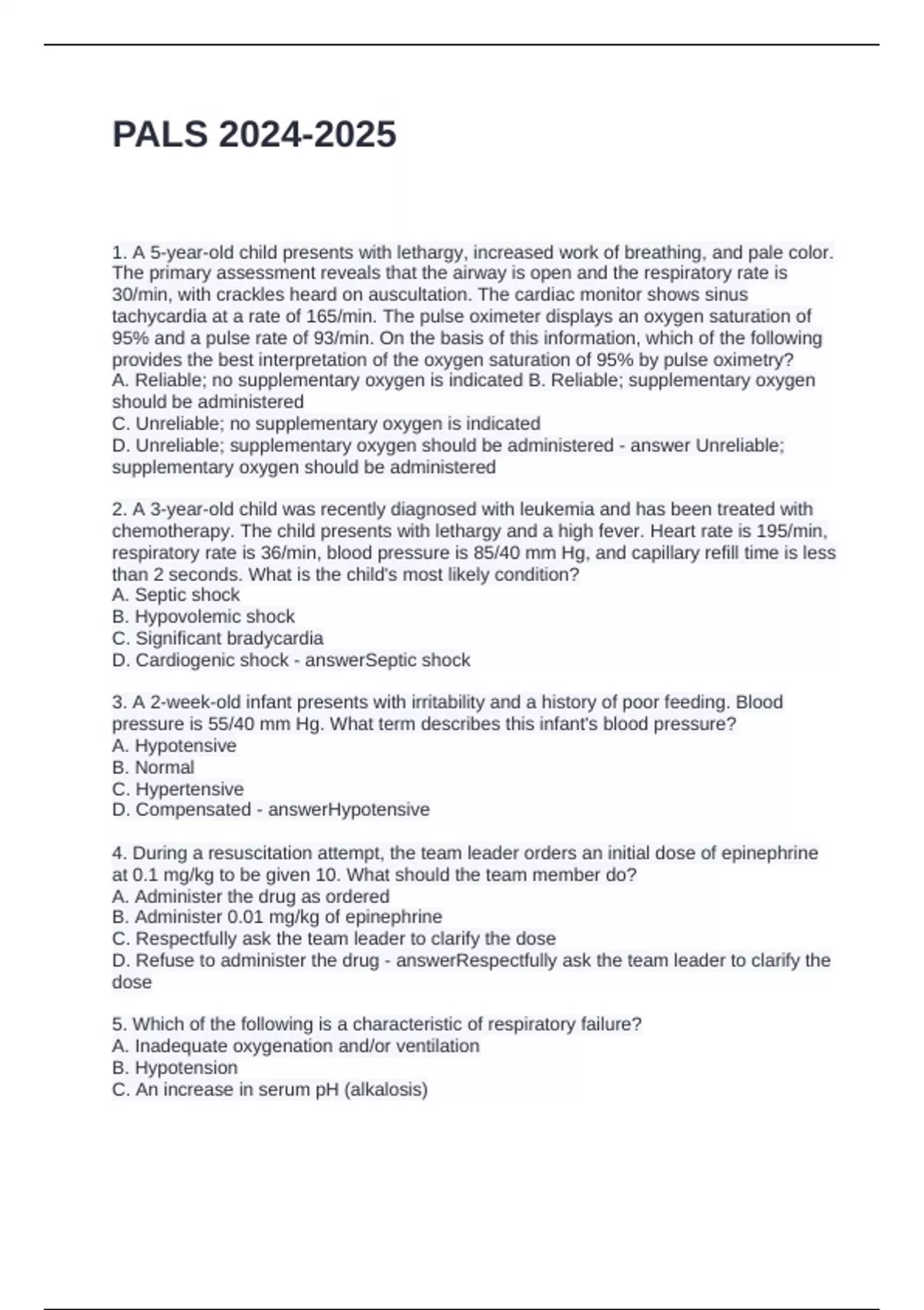 1. A 5-year-old child presents with lethargy, increased work of breathing, and pale color.