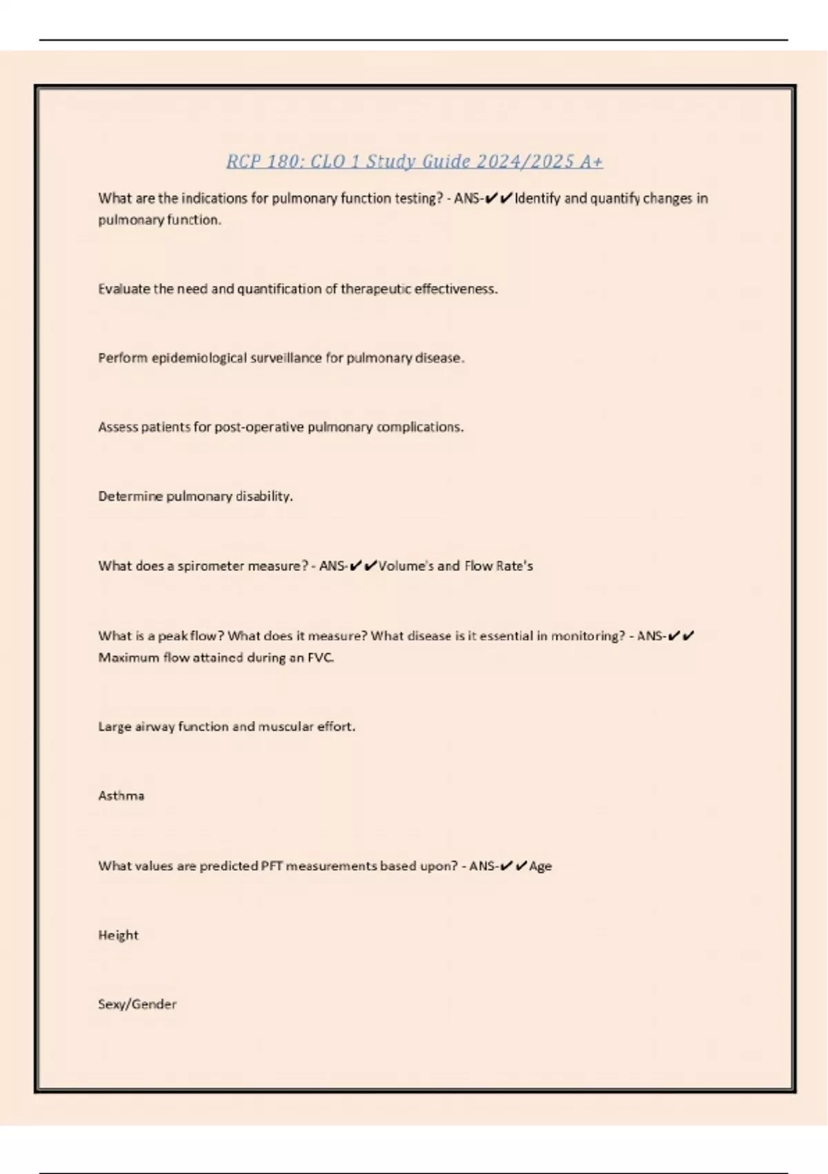 RCP 180: CLO 1 Study Guide 2024/2025 A+ What are the indications for pulmonary function testing? - ANS-Identify and quantify changes in pulmonary function. Evaluate the need and quantification of therapeutic effectiveness. Perform epidemiological surveillance for pulmonary disease. Assess patients for post-operative pulmonary complications. Determine pulmonary disability. What does a spirometer measure? - ANS-Volume's and Flow Rate's What is a peak flow? What does it measure? What disease is it essential in monitoring? - ANS- Maximum flow attained during an FVC. Large airway function and muscular effort. Asthma What values are predicted PFT measurements based upon? - ANS-Age Height Sex/Gender Continues...