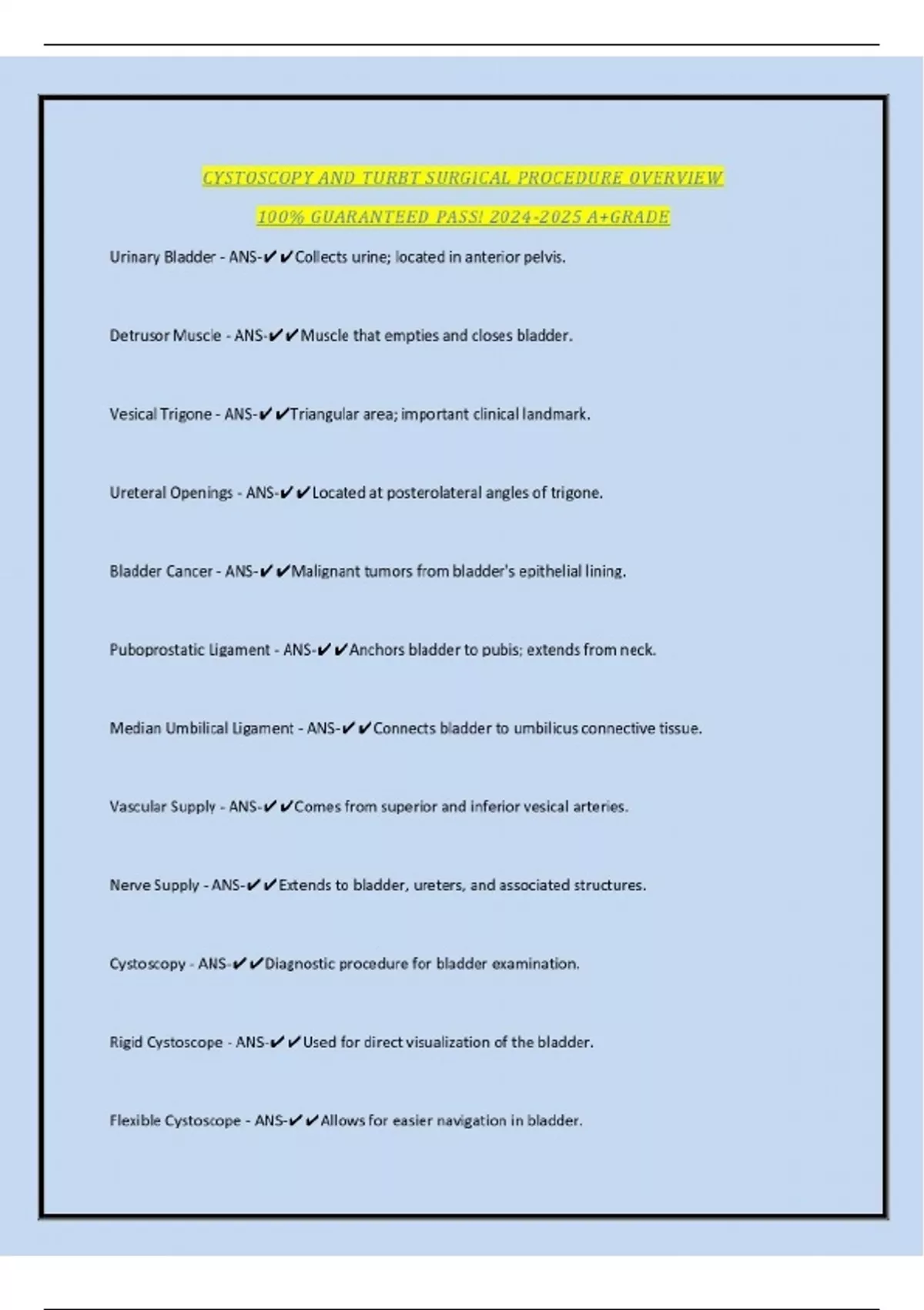 CYSTOSCOPY AND TURBT SURGICAL PROCEDURE OVERVIEW 100% GUARANTEED PASS! A+GRADE Urinary Bladder - ANS-Collects urine; located in anterior pelvis. Detrusor Muscle - ANS-Muscle that empties and closes bladder. Vesical Trigone - ANS-Triangular area; important clinical landmark. Ureteral Openings - ANS-Located at posterolateral angles of trigone. Bladder Cancer - ANS-Malignant tumors from bladder's epithelial lining. Puboprostatic Ligament - ANS-Anchors bladder to pubis; extends from neck. Median Umbilical Ligament - ANS-Connects bladder to umbilicus connective tissue. Vascular Supply - ANS-Comes from superior and inferior vesical arteries. CONTINUES...