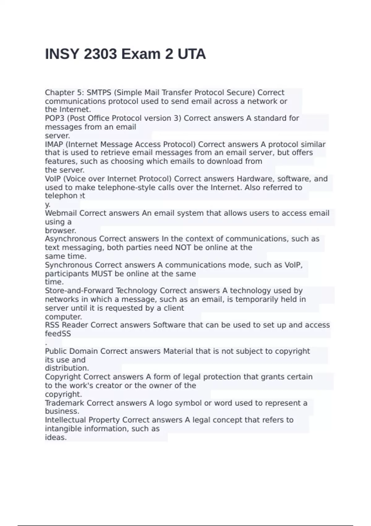 Chapter 5: SMTPS (Simple Mail Transfer Protocol Secure) Correct answers A communications protocol used to send email across a network or the Internet. POP3 (Post Office Protocol version 3) Correct answers A standard for retrieving email messages from an email server. IMAP (Internet Message Access Protocol) Correct answers A protocol similar to POP that is used to retrieve email messages from an email server, but offers additional features, such as choosing which emails to download from the server. VoIP (Voice over Internet Protocol) Correct answers Hardware, software, and protocols used to make telephone-style calls over the Internet. Also referred to as Internet telephony. Webmail Correct answers An email system that allows users to access email messages using a browser. Asynchronous Correct answers In the context of communications, such as email and text messaging, both parties need NOT be online at the same time. Synchronous Correct answers A communications mode, such as VoIP, in which participants MUST be online at the same time. Store-and-Forward Technology Correct answers A technology used by communications networks in which a message, such as an email, is temporarily held in storage on a server until it is requested by a client computer. RSS Reader Correct answers Software that can be used to set up and access an RSS feed. Public Domain Correct answers Material that is not subject to copyright restrictions on its use and distribution. Copyright Correct answers A form of legal protection that grants certain exclusive rights to the work's creator or the owner of the copyright. Trademark Correct answers A logo symbol or word used to represent a business. Intellectual Property Correct answers A legal concept that refers to ownership of intangible information, such as ideas.