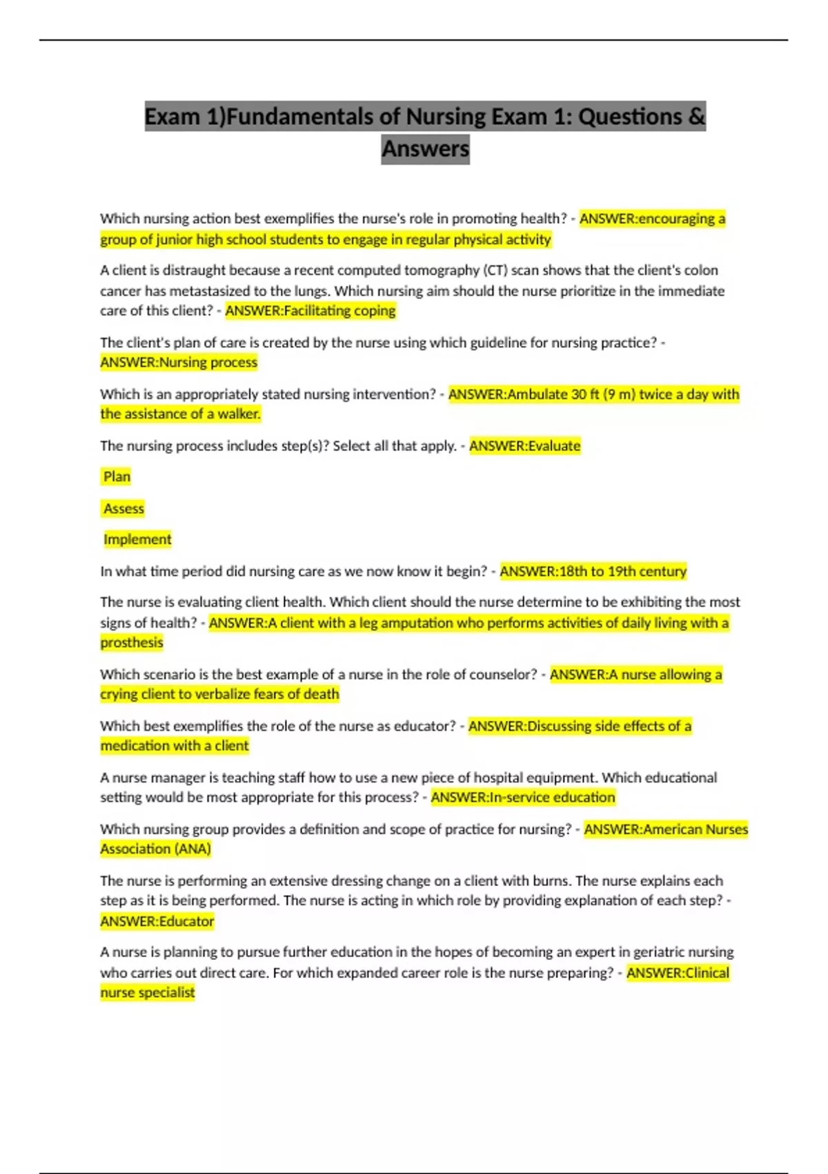 Exam 1)Fundamentals of Nursing Exam 1: Questions & Answers